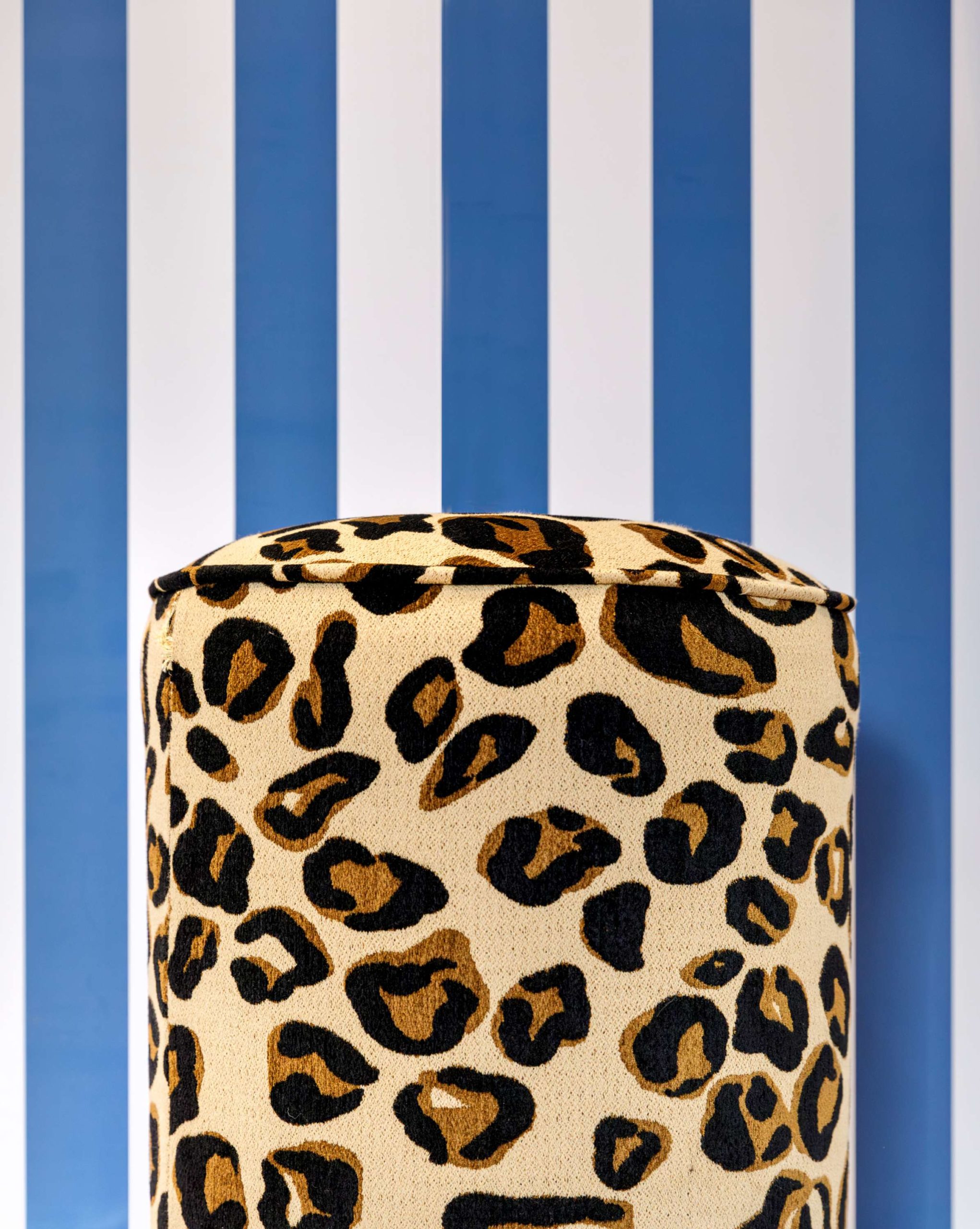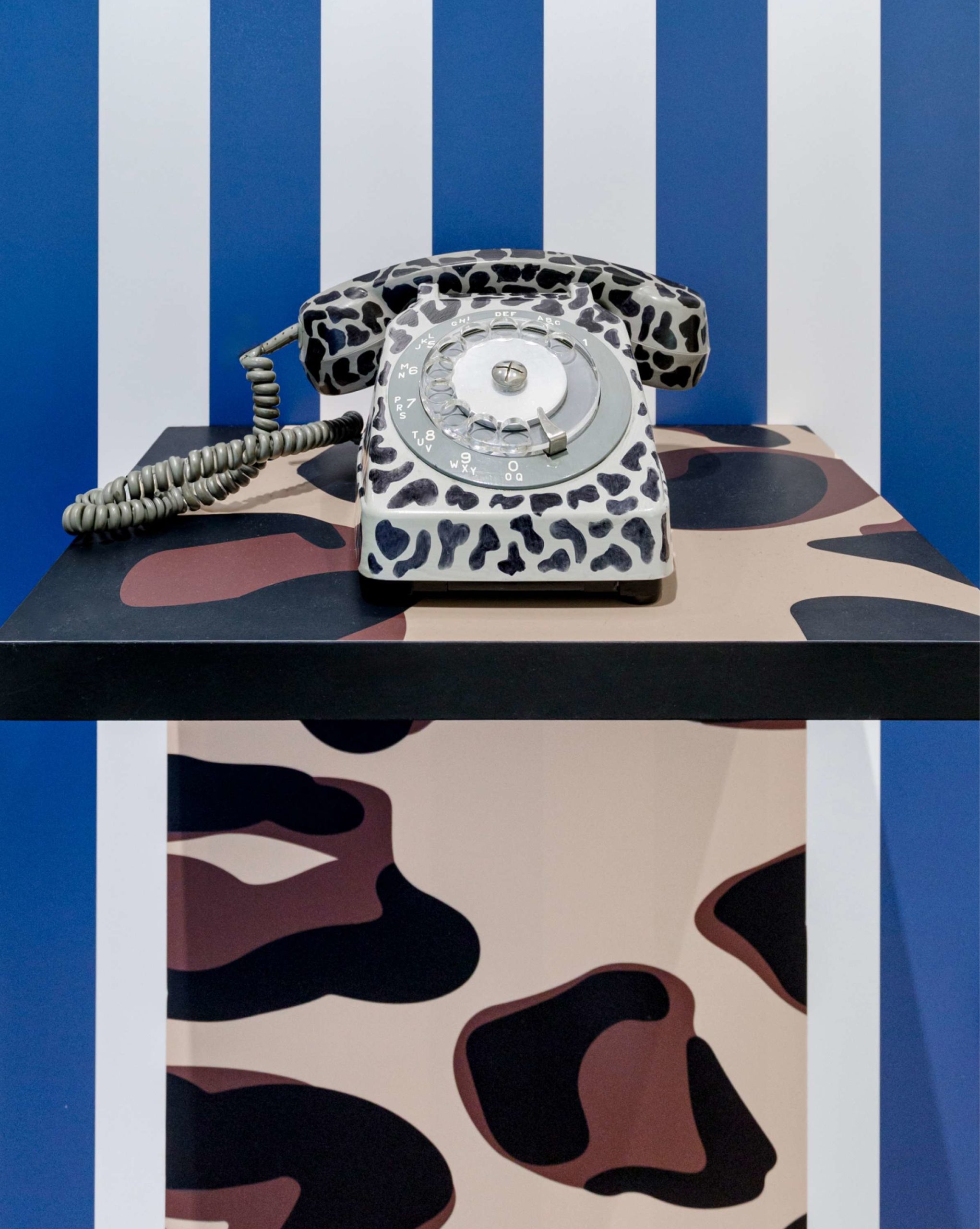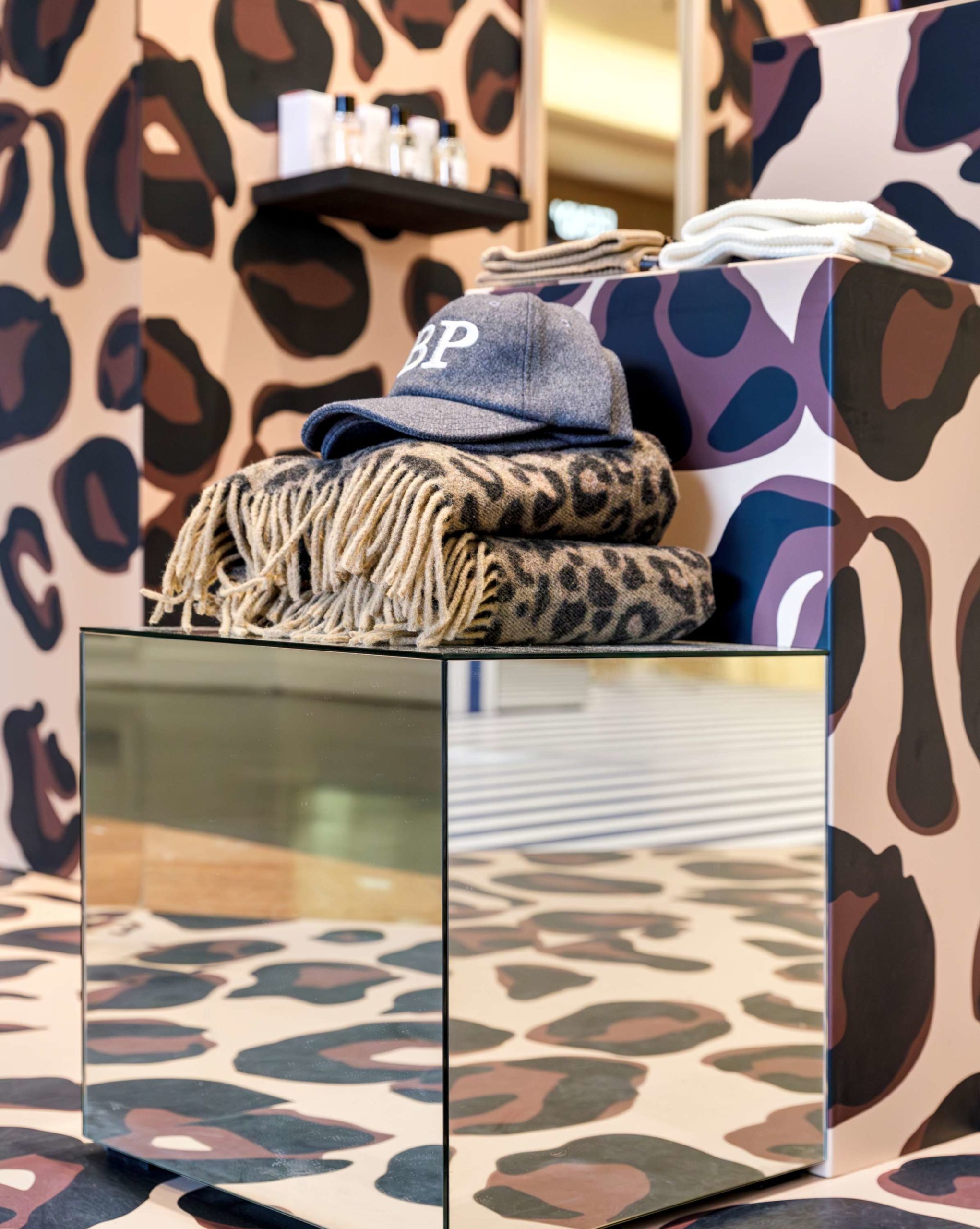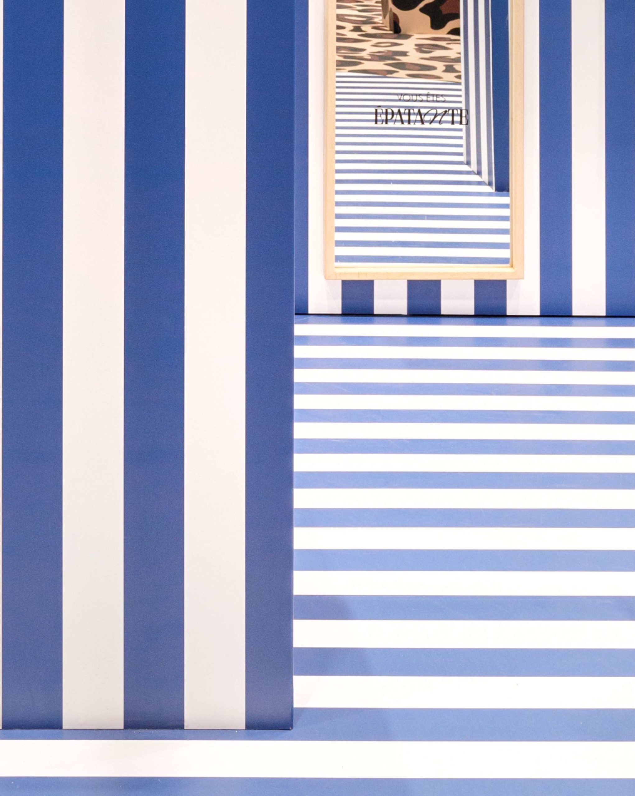tout droit tirées de la collection elle-même. C’est pourquoi les motifs “rayures” et “léopard” sont au centre de notre réflexion et de ce concept. Les produits phares et la maroquinerie sont mis en avant grâce à un système ingénieux de podiums et de cubes bruts, pendant que les miroirs en arches et le bois foncé apportent rondeur et chaleur à l’ensemble. Petit plus : un téléphone rétro et un distributeur à tickets de tombola attirent les passants les plus curieux…