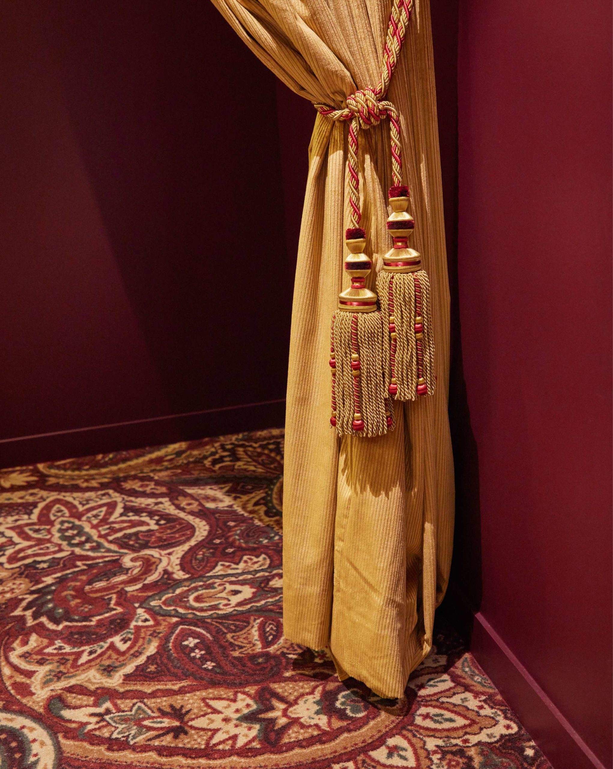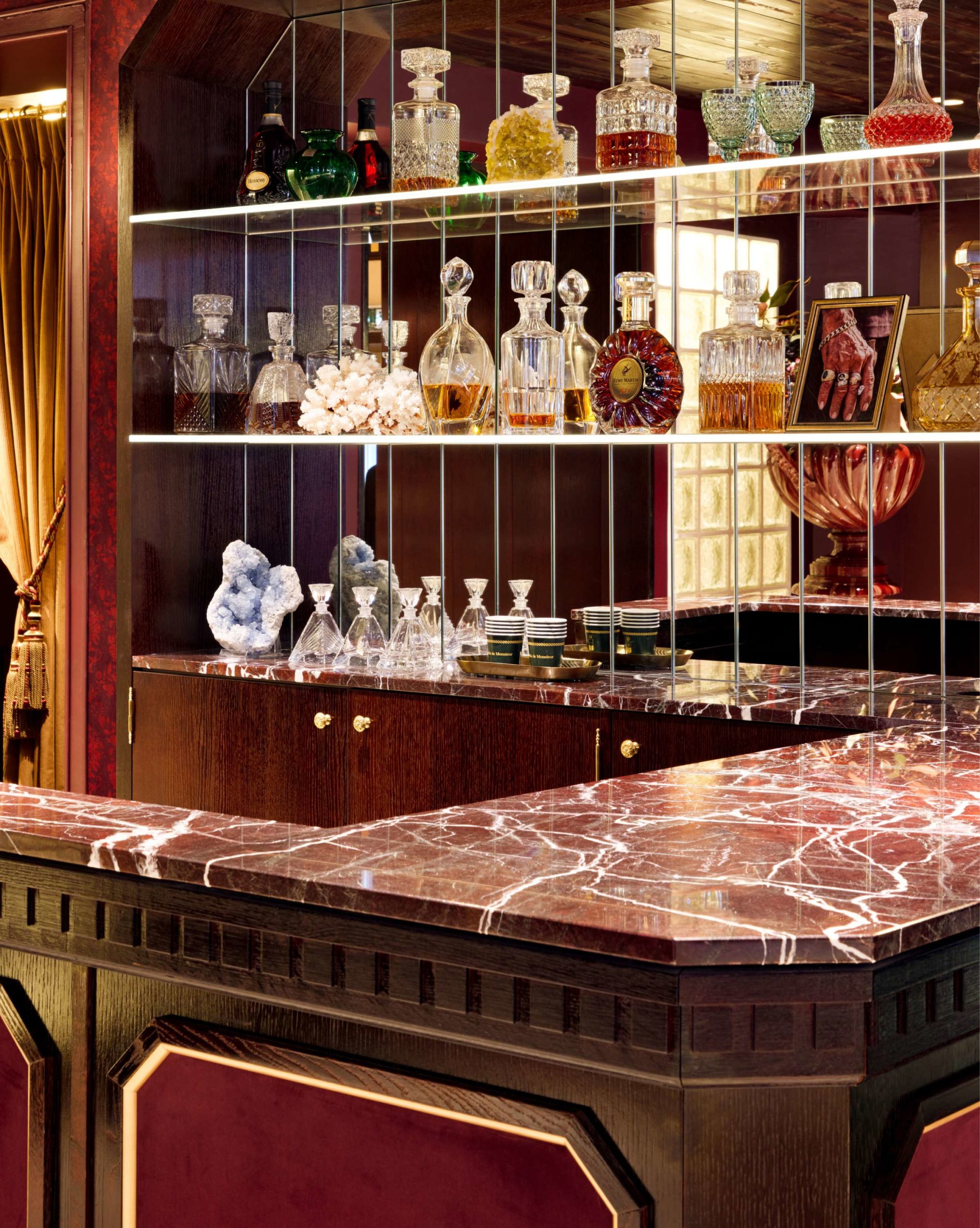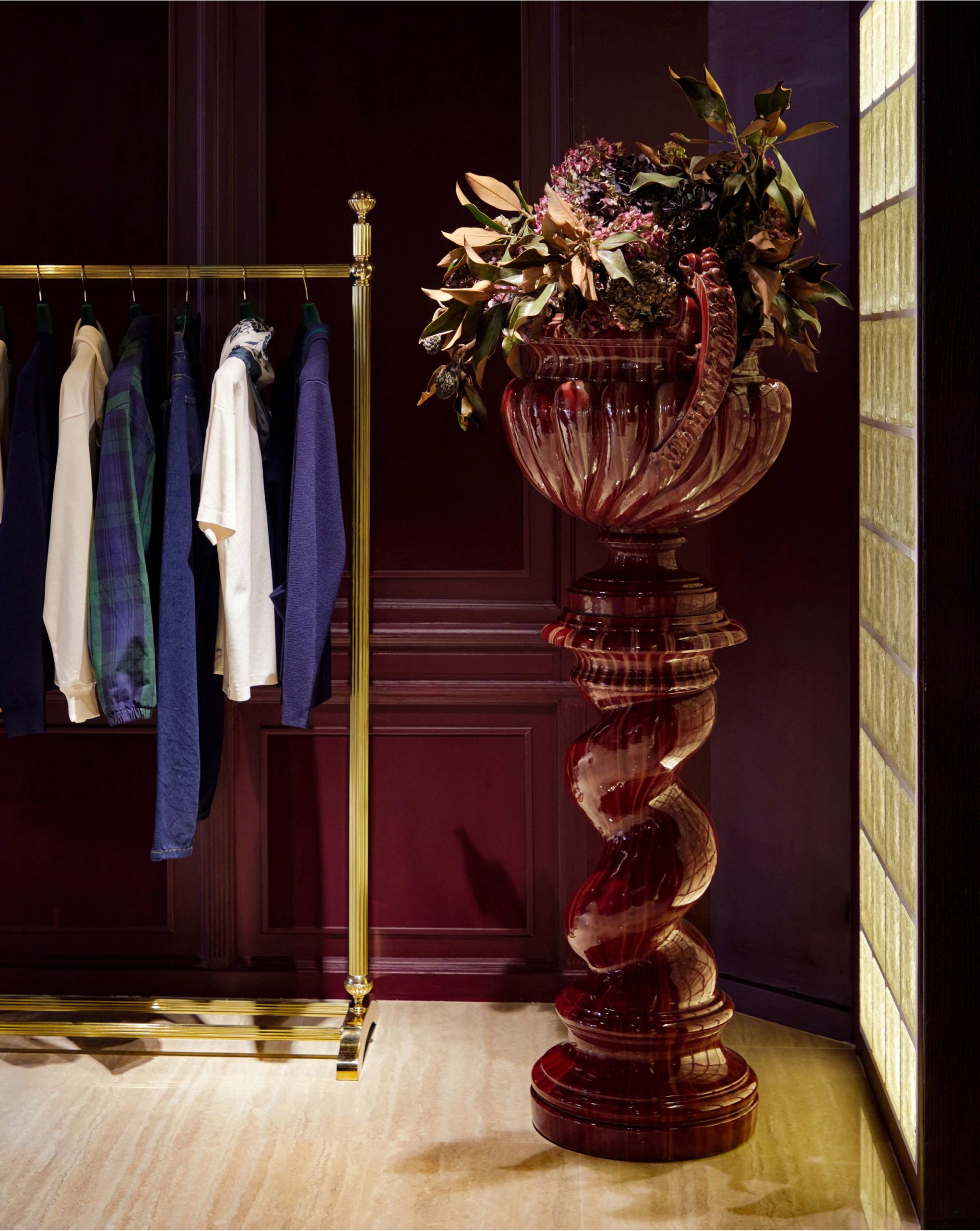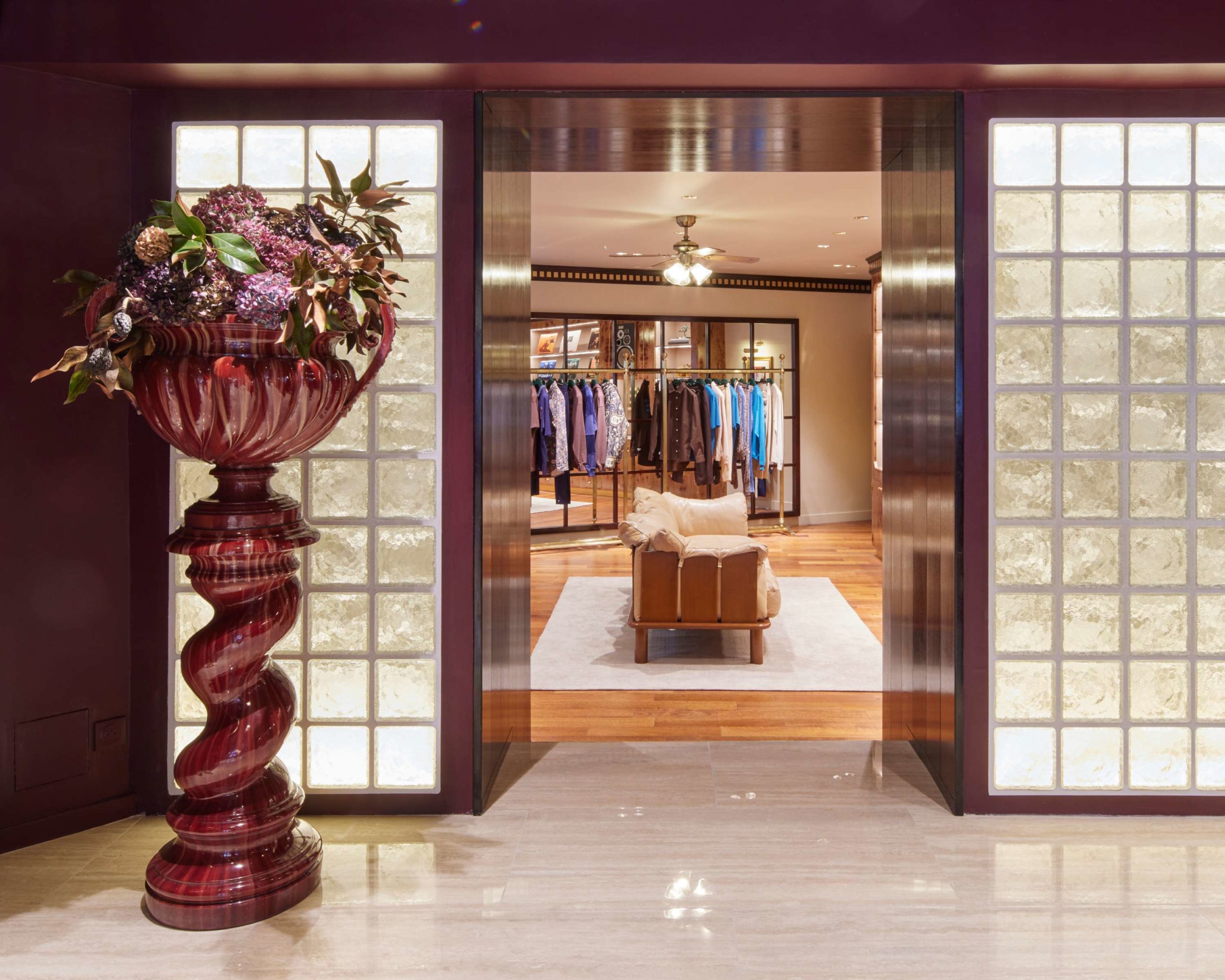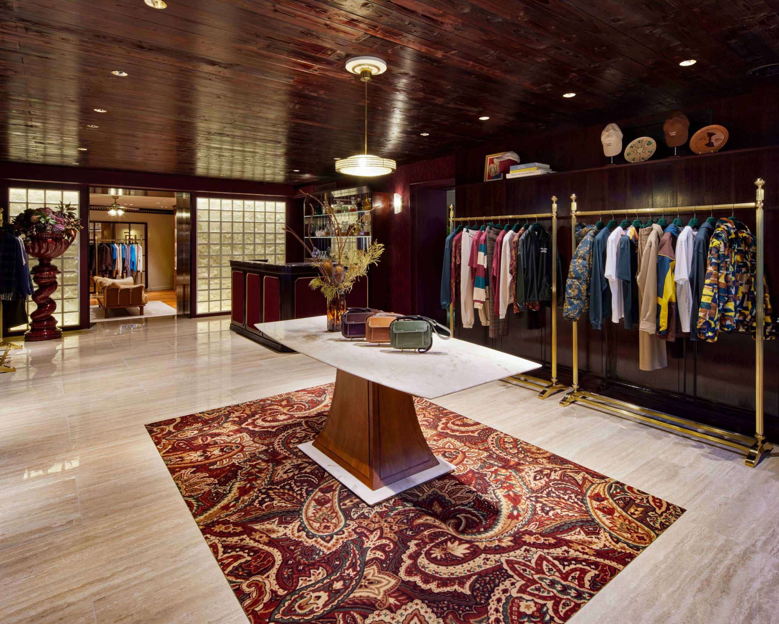 de lumière travaillée, et d’esprit 70s et 90s. Le marbre, la moquette à motif paisley, le velours et et le laiton brillant ont été choisis pour offrir un aspect élégant et raffiné à la boutique.
