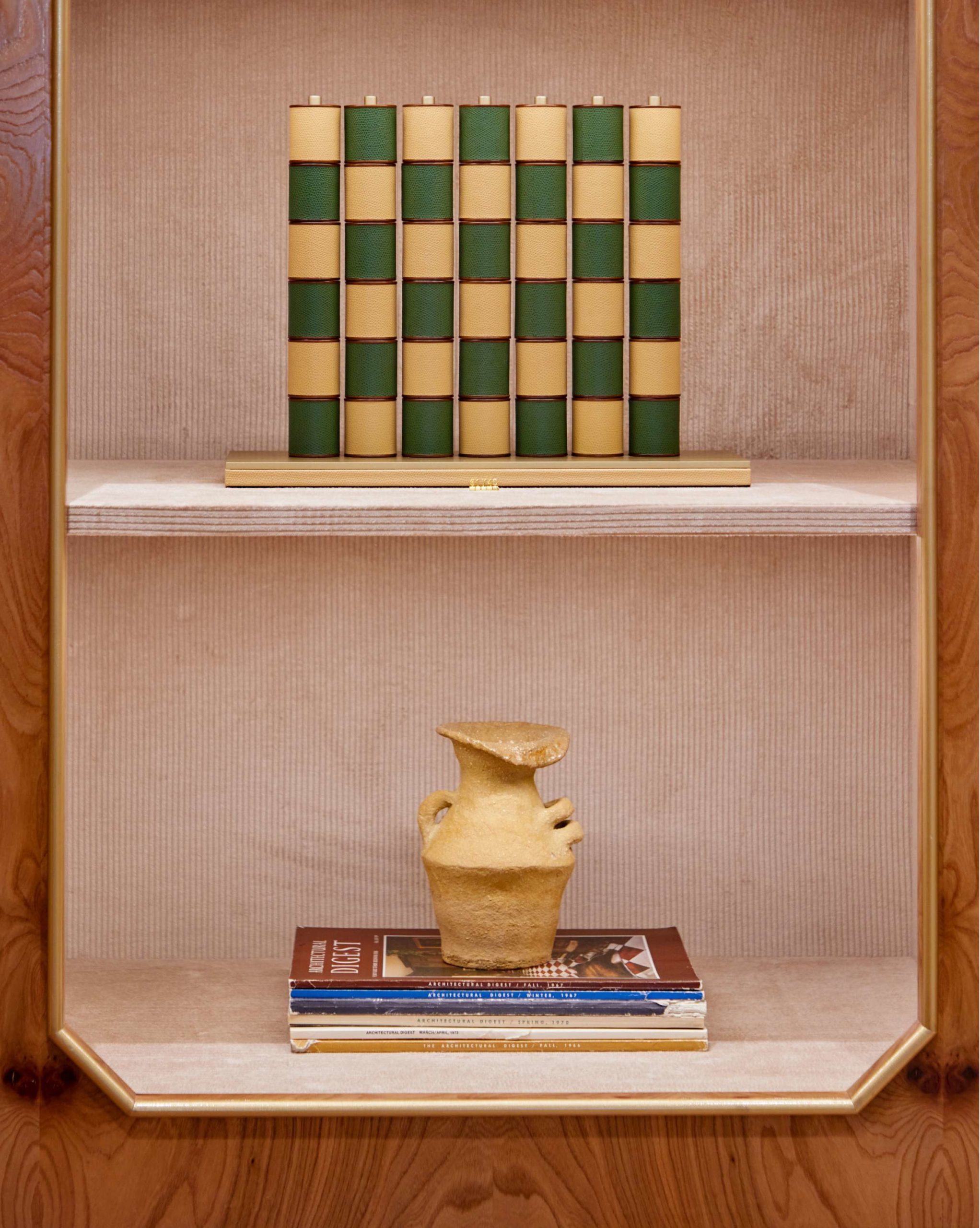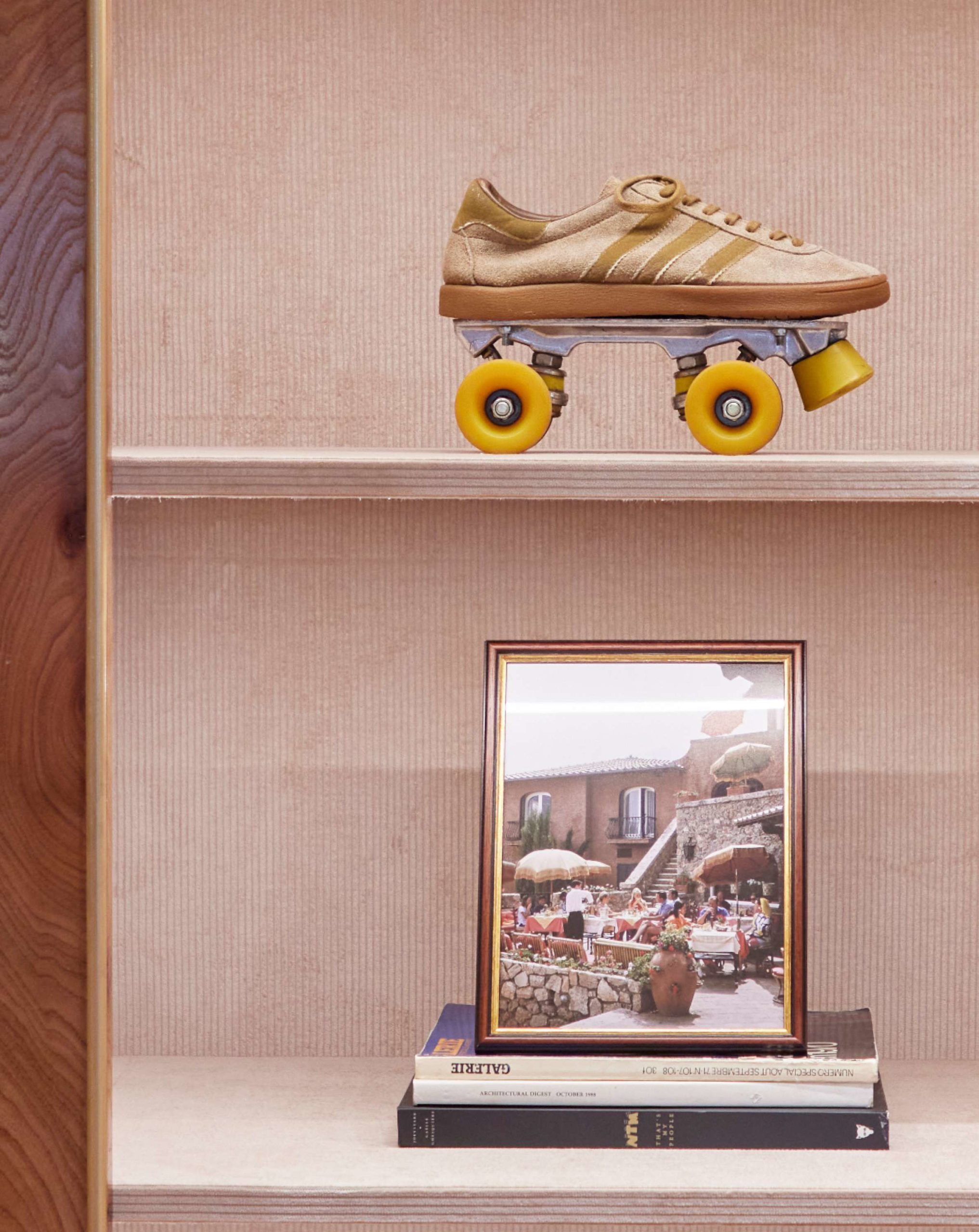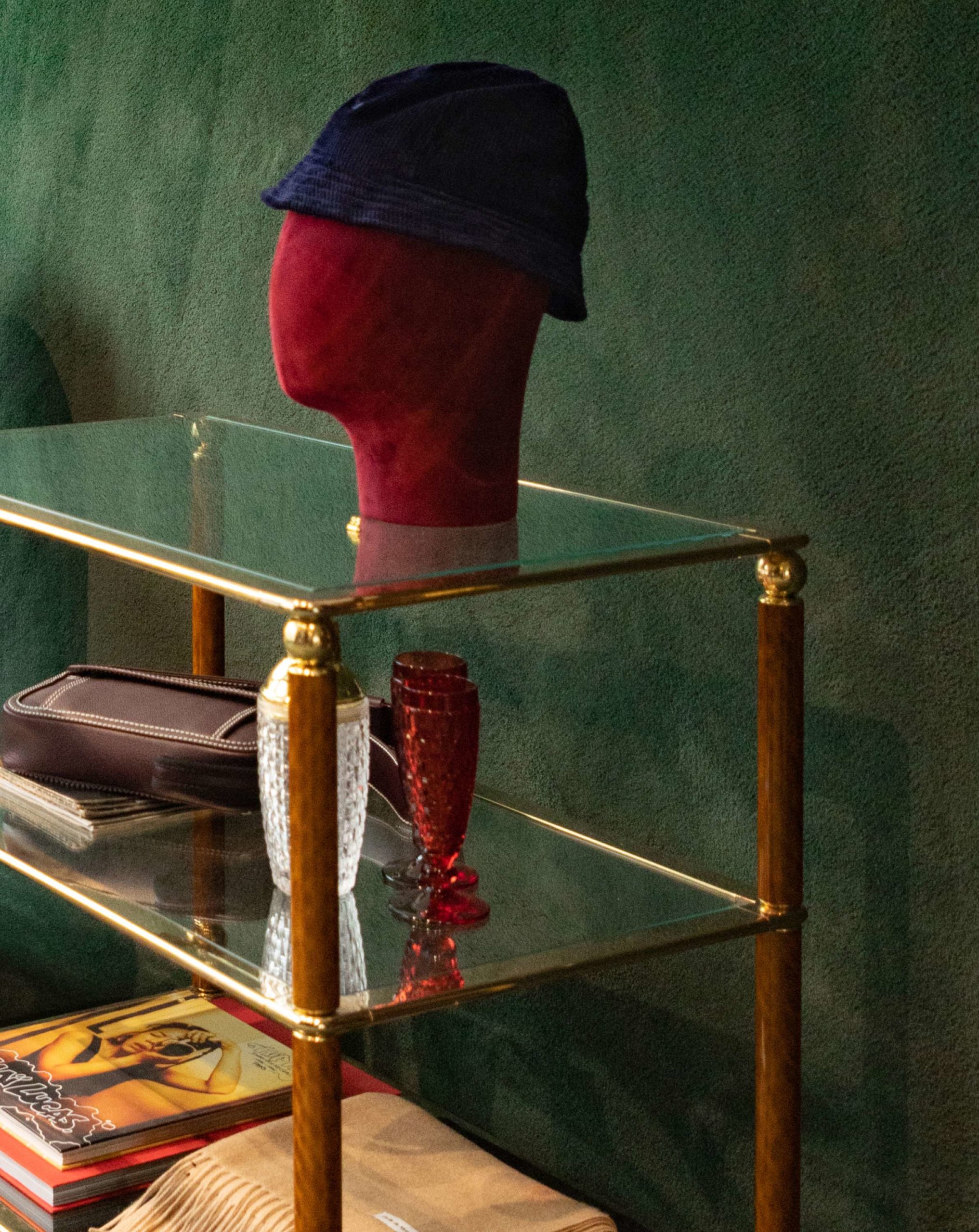 est la bibliothèque en loupe d’orme qui offre une atmosphère nostalgique à la deuxième “zone” de la boutique. Elle fait face à un canapé chiné en cuir et noyer de De Pas, D’Urbino & Lomazzi, et à eux deux, ces éléments retranscrivent parfaitement “l’esprit Drôle de Monsieur” et ses influences.