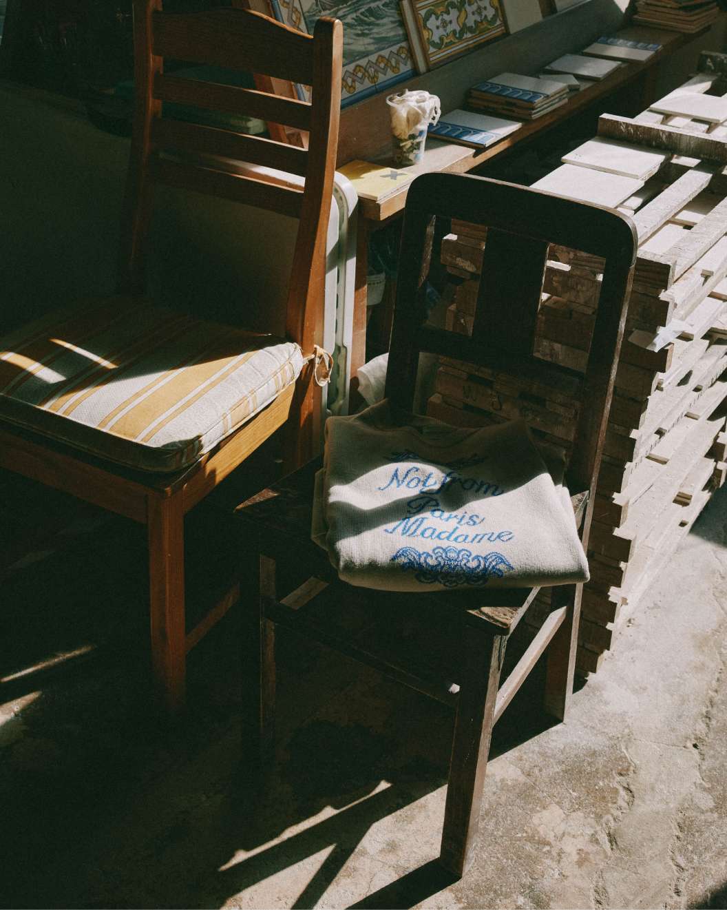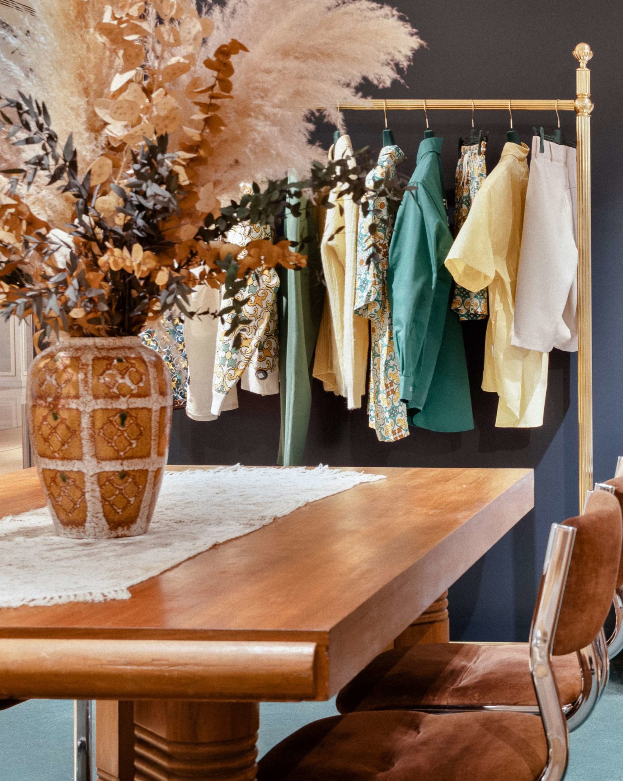 La moquette verte pour la nature, un bleu foncé rehaussé aux couleurs de la collection, et surtout une fontaine centrale sur mesure en azulejos sortie d’un atelier Portugais. Les portants brillants sont en laiton, les tables et fauteuils en bois sont chinés, et le totem identitaire n’est rien d’autre qu’un oranger, source d’inspiration principale de toute la collection. Les tonalités sont celles du voyage, et de la couleur de l’été.
