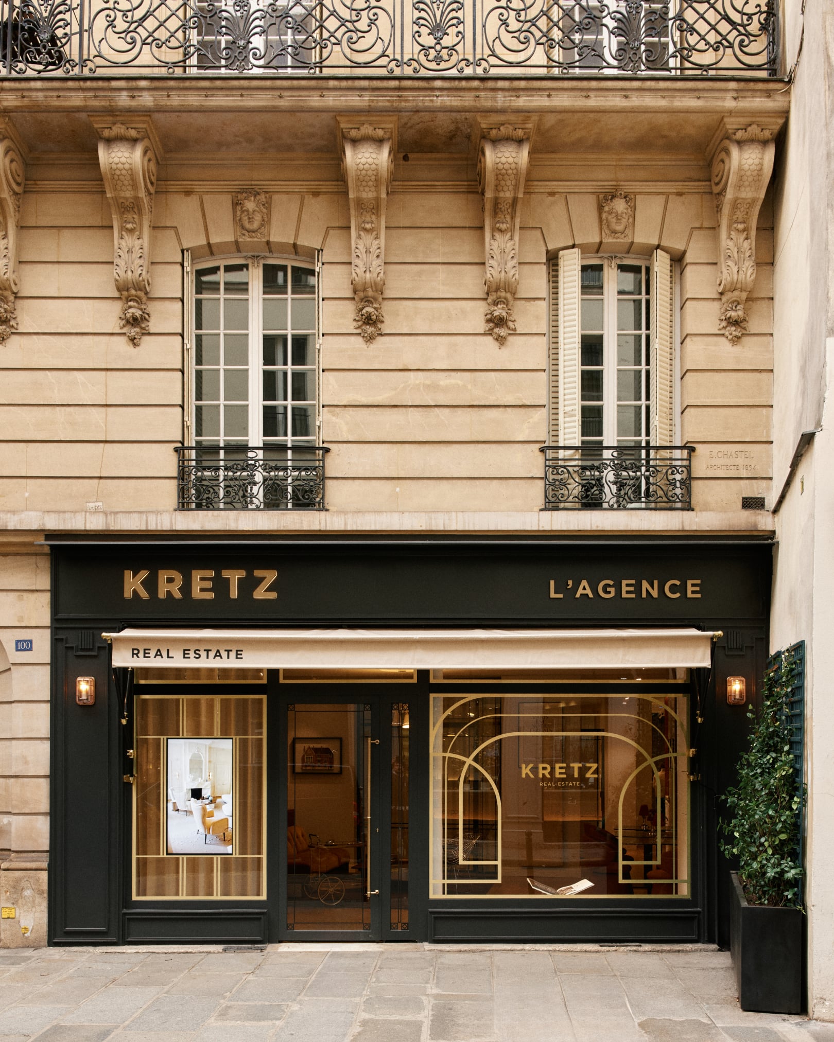 La devanture s’inspire de la façade de l’hôtel particulier boulonnais de la famille Kretz, enrichie de touches Art Déco. Elle exprime l’ADN familial de l’agence à travers une esthétique élégante et accueillante, donnant le ton d’un lieu dans lequel on entre comme dans une maison, imprégnée de souvenirs, de voyages et de moments de vie partagés.