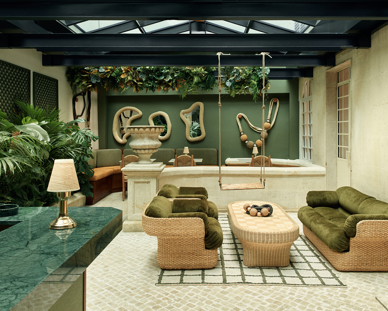 Le jardin d’hiver propose une immersion dépaysante dans l’univers de Tibau do Sul, le pied-à-terre brésilien de Sandrine et Olivier Kretz. Sandrine y partage avec Majo l’ambiance festive et chaleureuse du Brésil, à travers ses couleurs, sa lumière et ses textures.