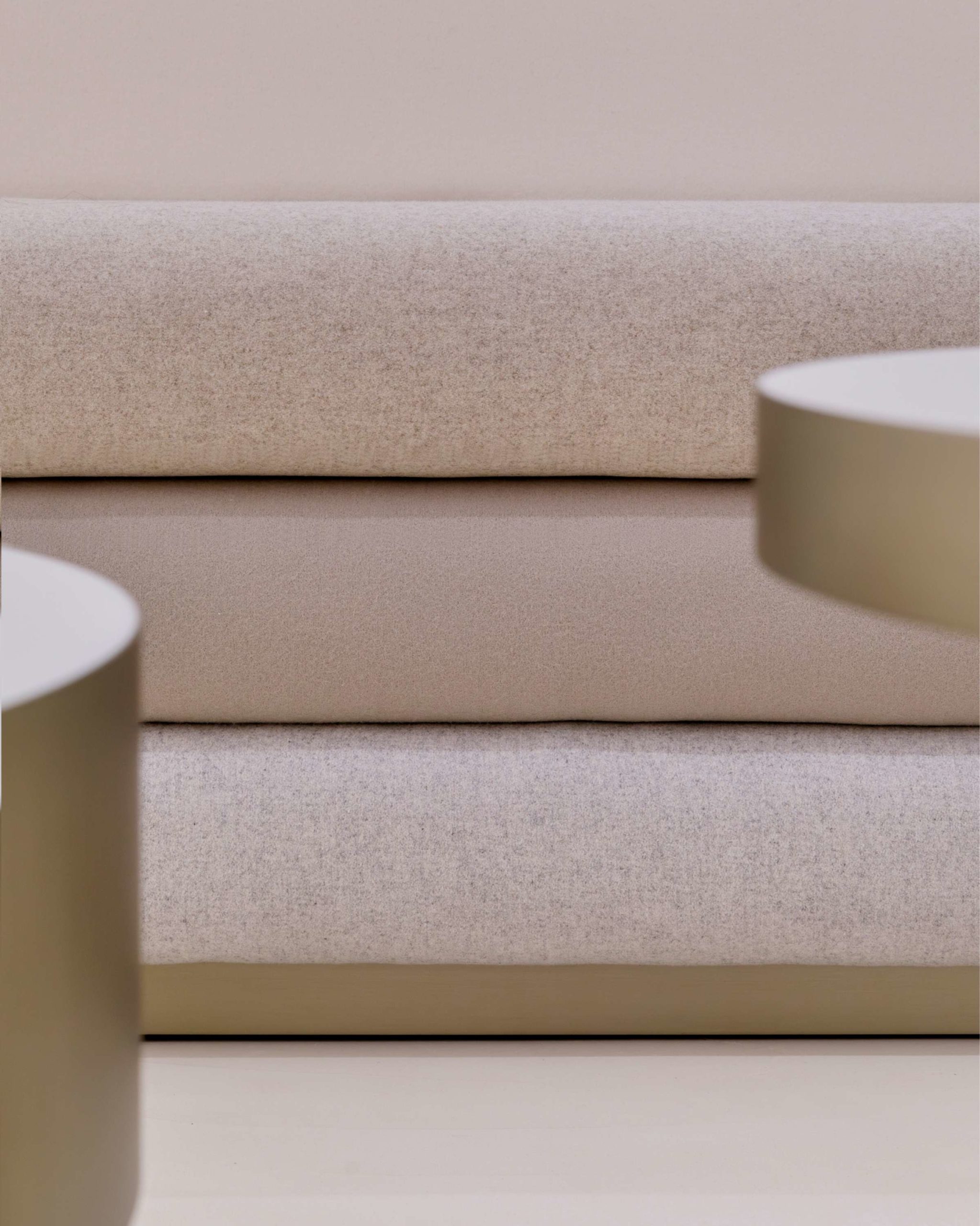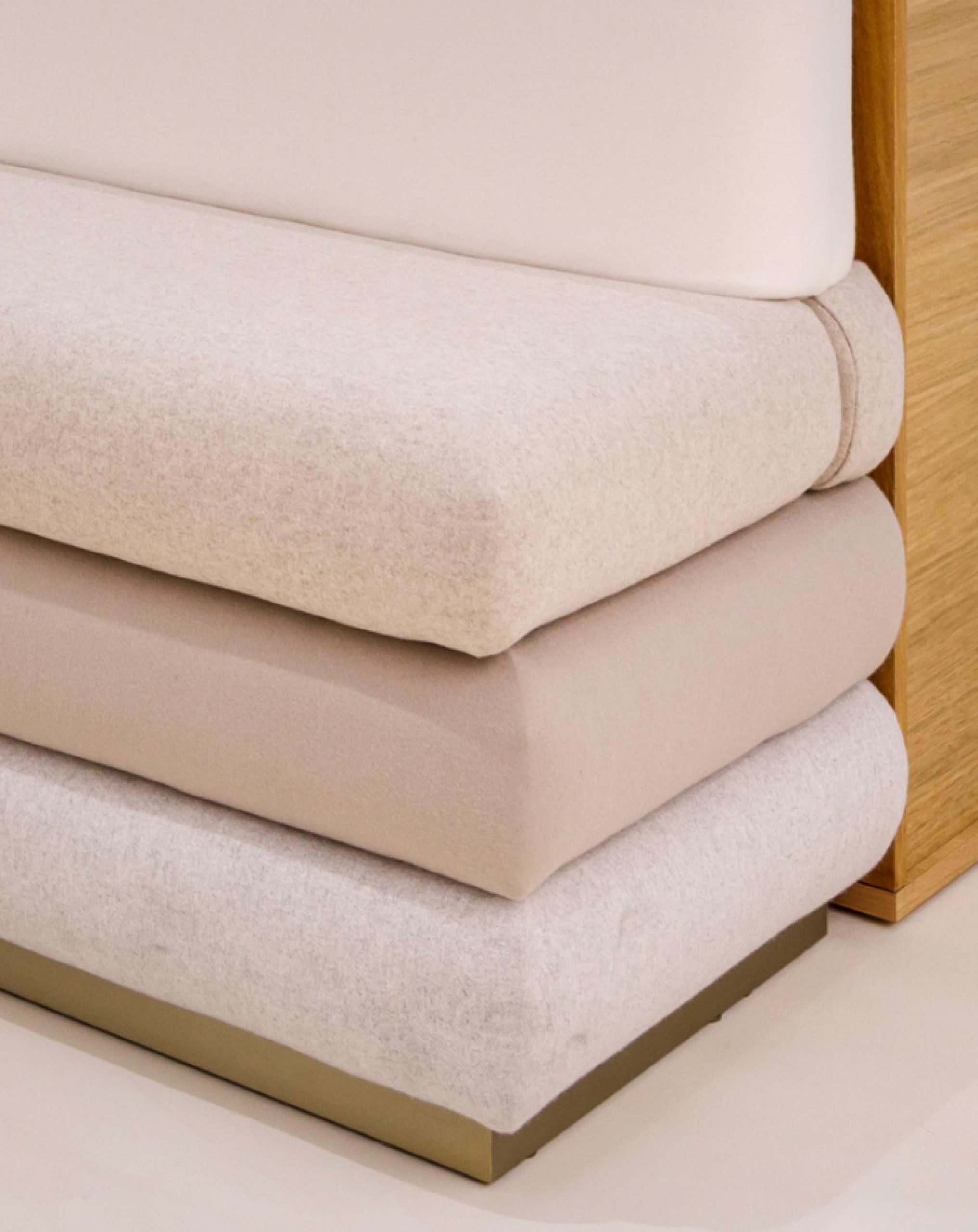 se fait à travers le luminaire souple qui traverse les différents espaces, mais aussi grâce à la superposition du tissu des banquettes et de leur esprit matelassé. Du laiton est lui utilisé pour les tubes des étagères produits, autour du drapeau de la façade et sur le cerclage des plateaux de table basse.