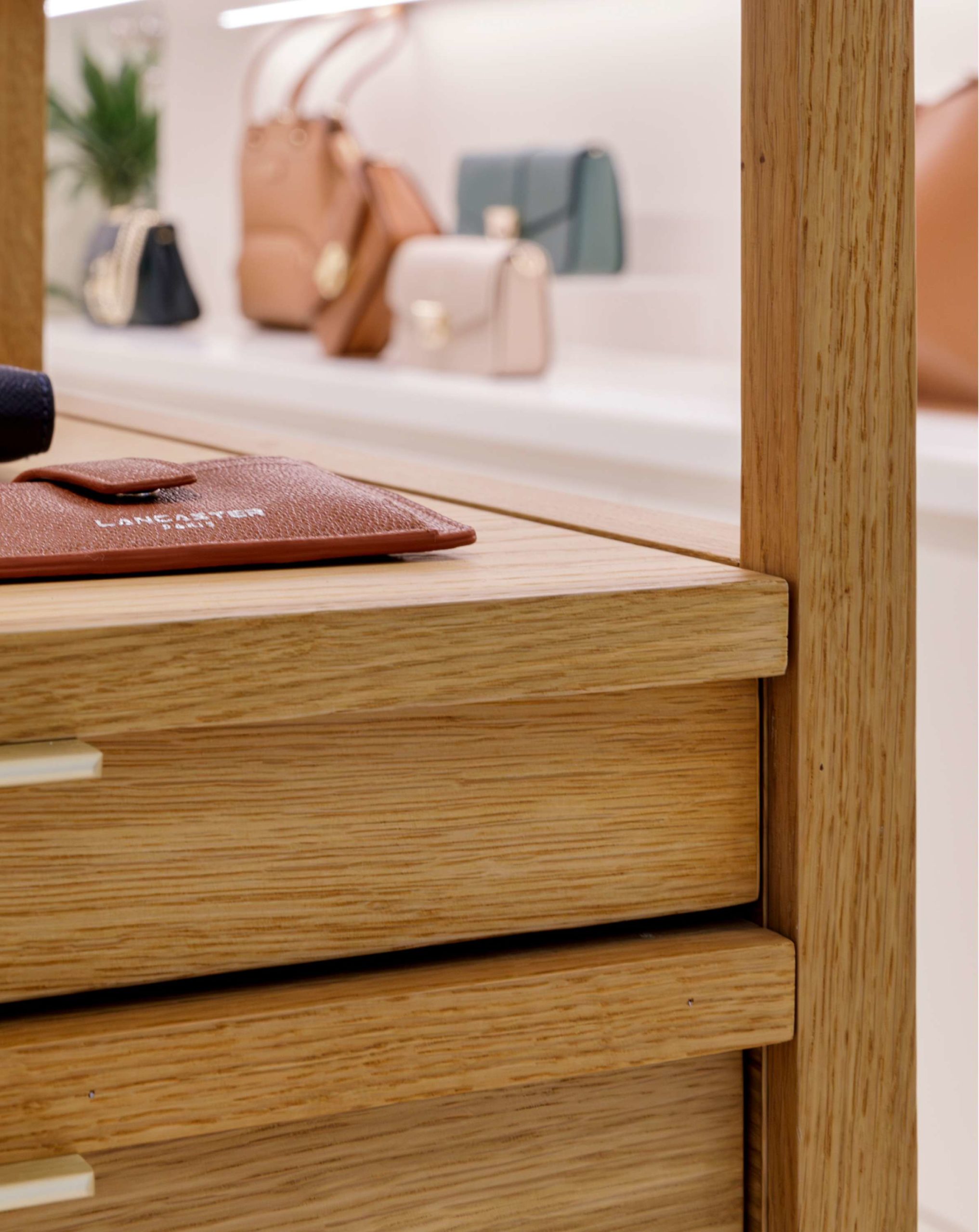 Le nouveau flasghip de la marque retrouve aujourd’hui les allures d’un écrin épuré, et devient une boutique minimaliste et lumineuse. Un meuble de métier en bois revisité afin de valoriser l’artisanat, un luminaire souple et continu pour réinterpréter la souplesse du cuir, et un jeu de textures et de matériaux font référence aux différents aspects du cuir, dans le soucis de valoriser chaque produit de maroquinerie.