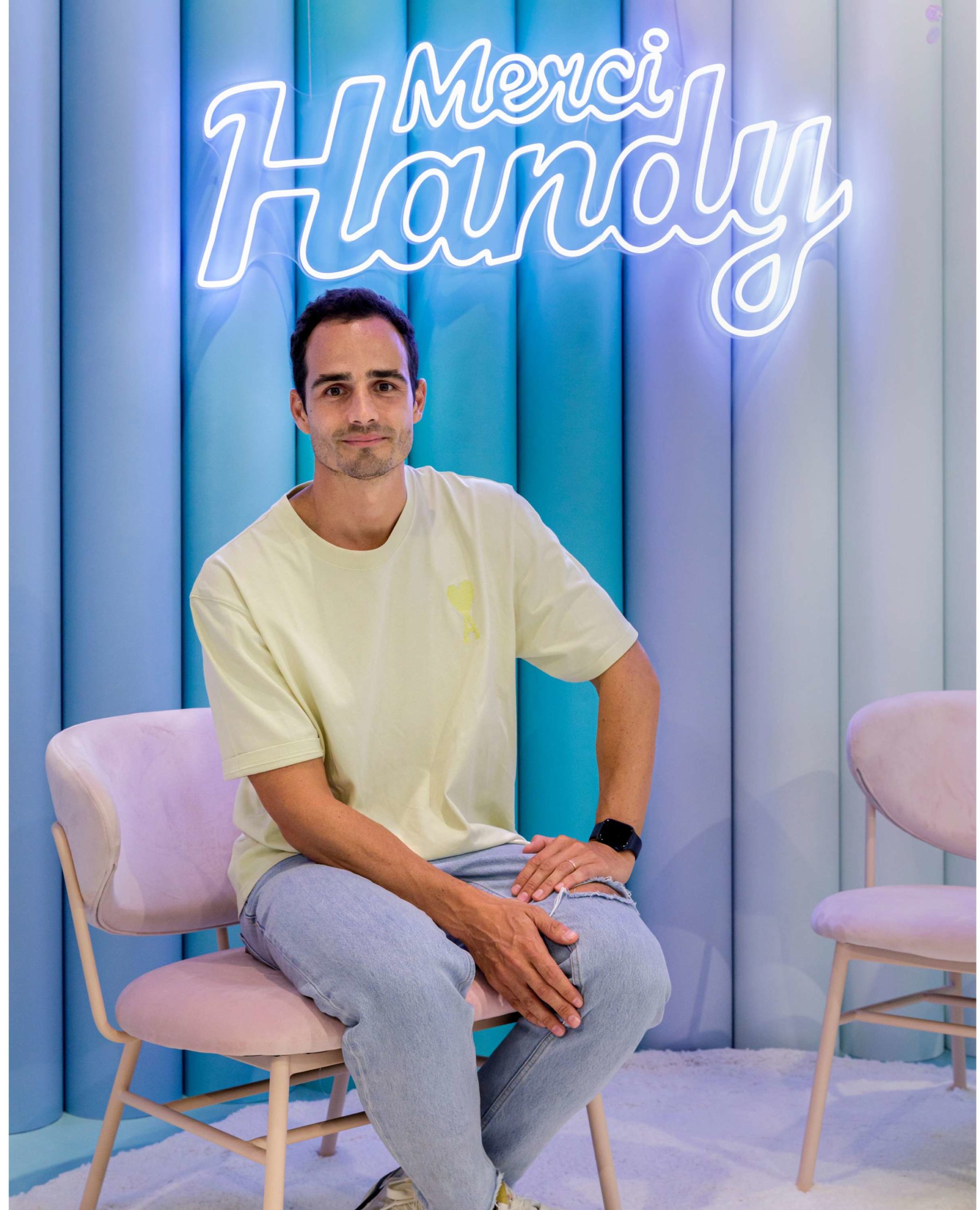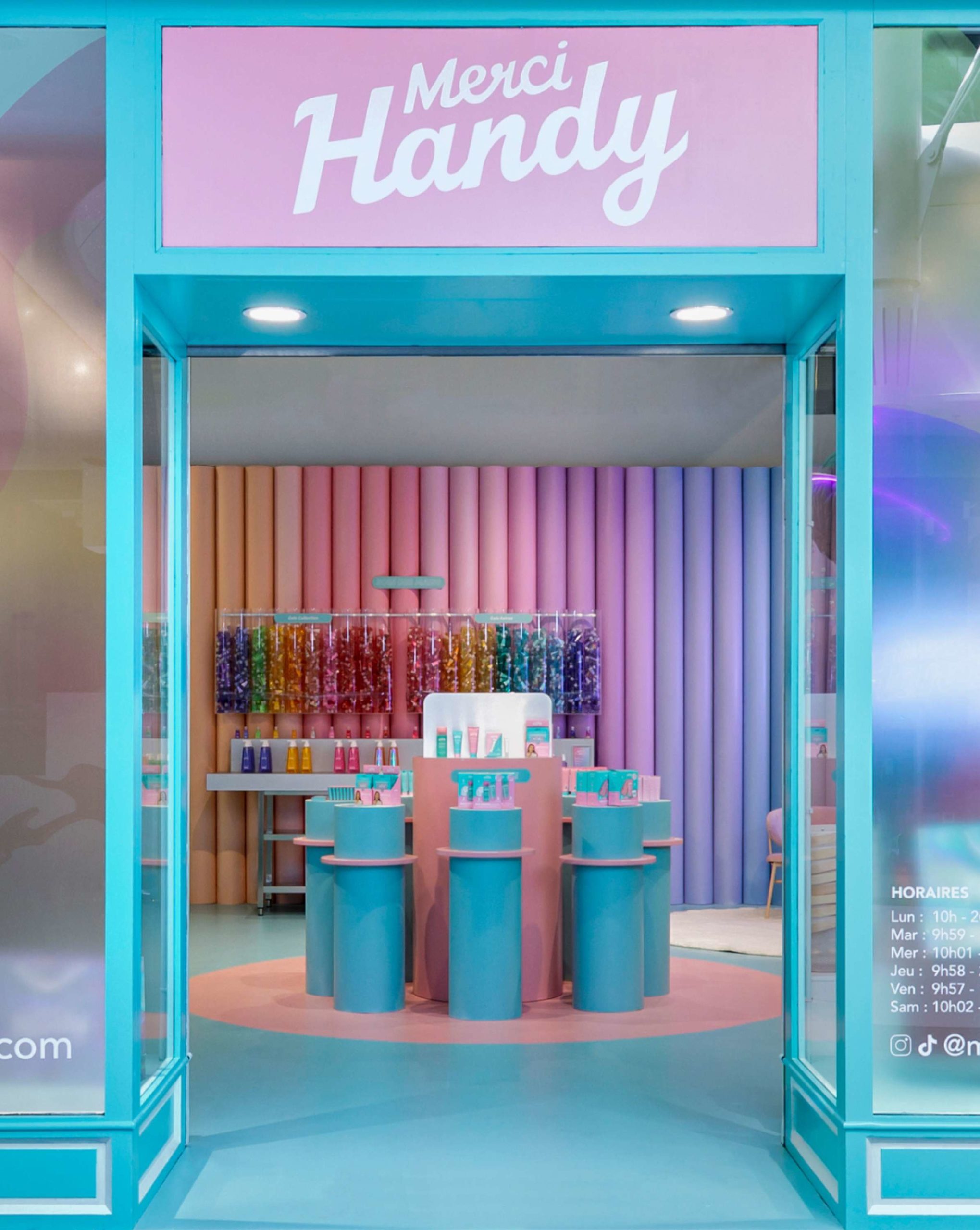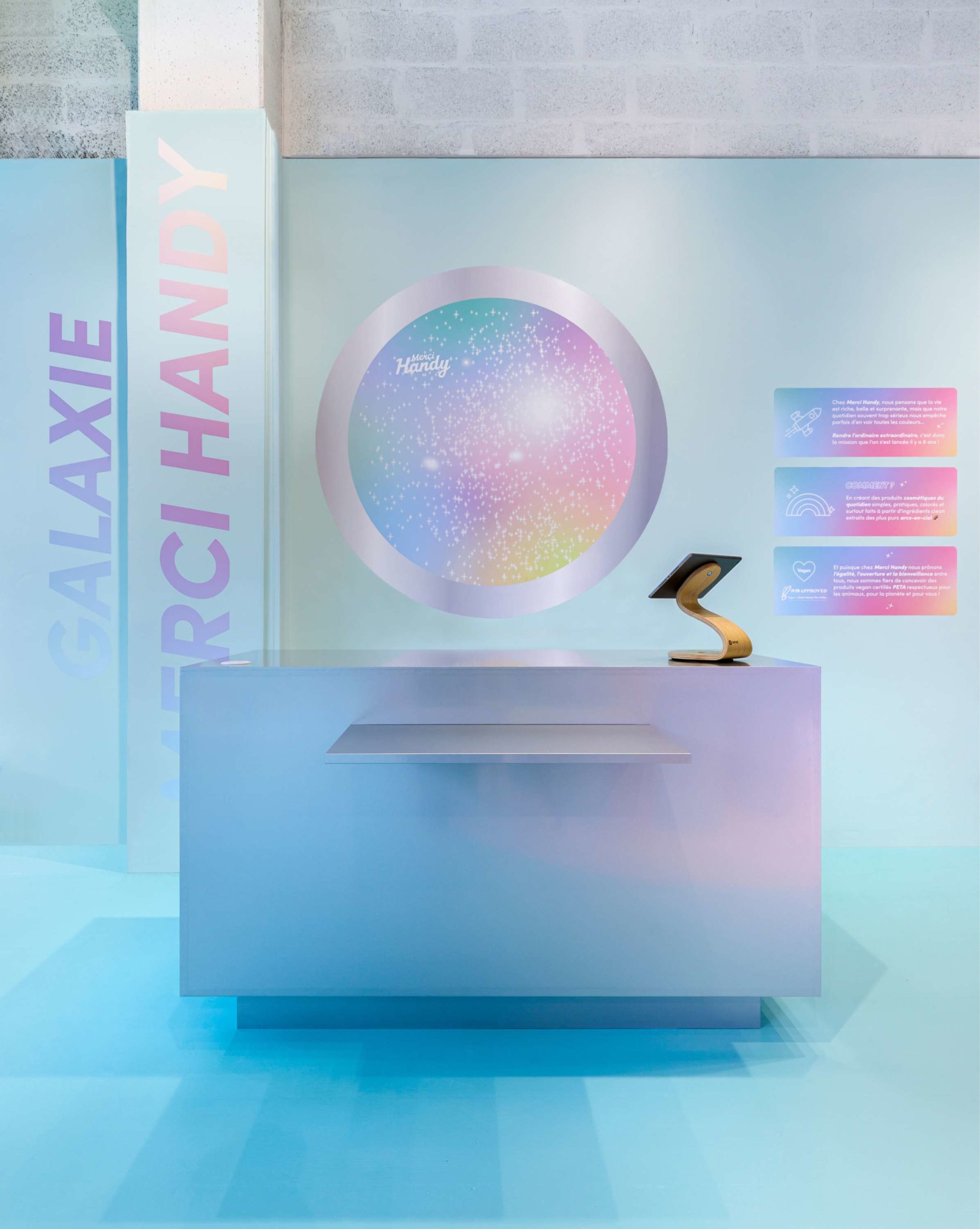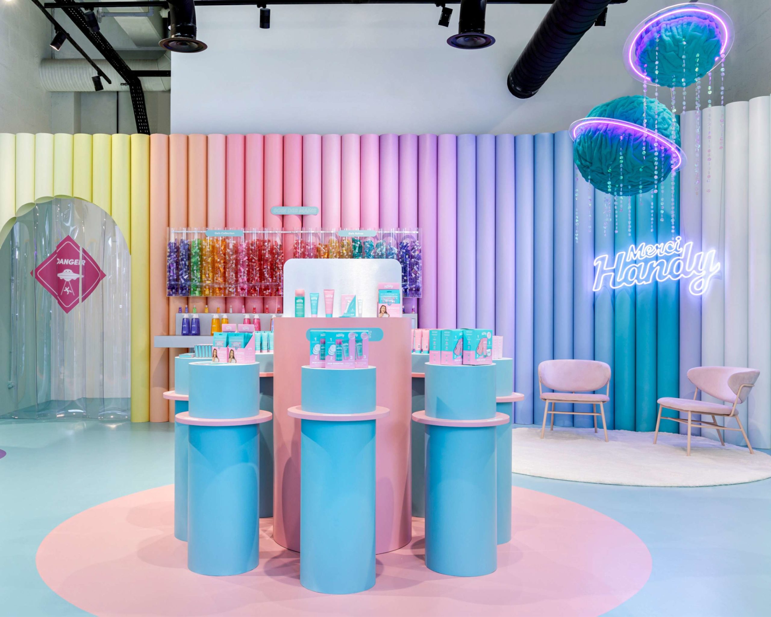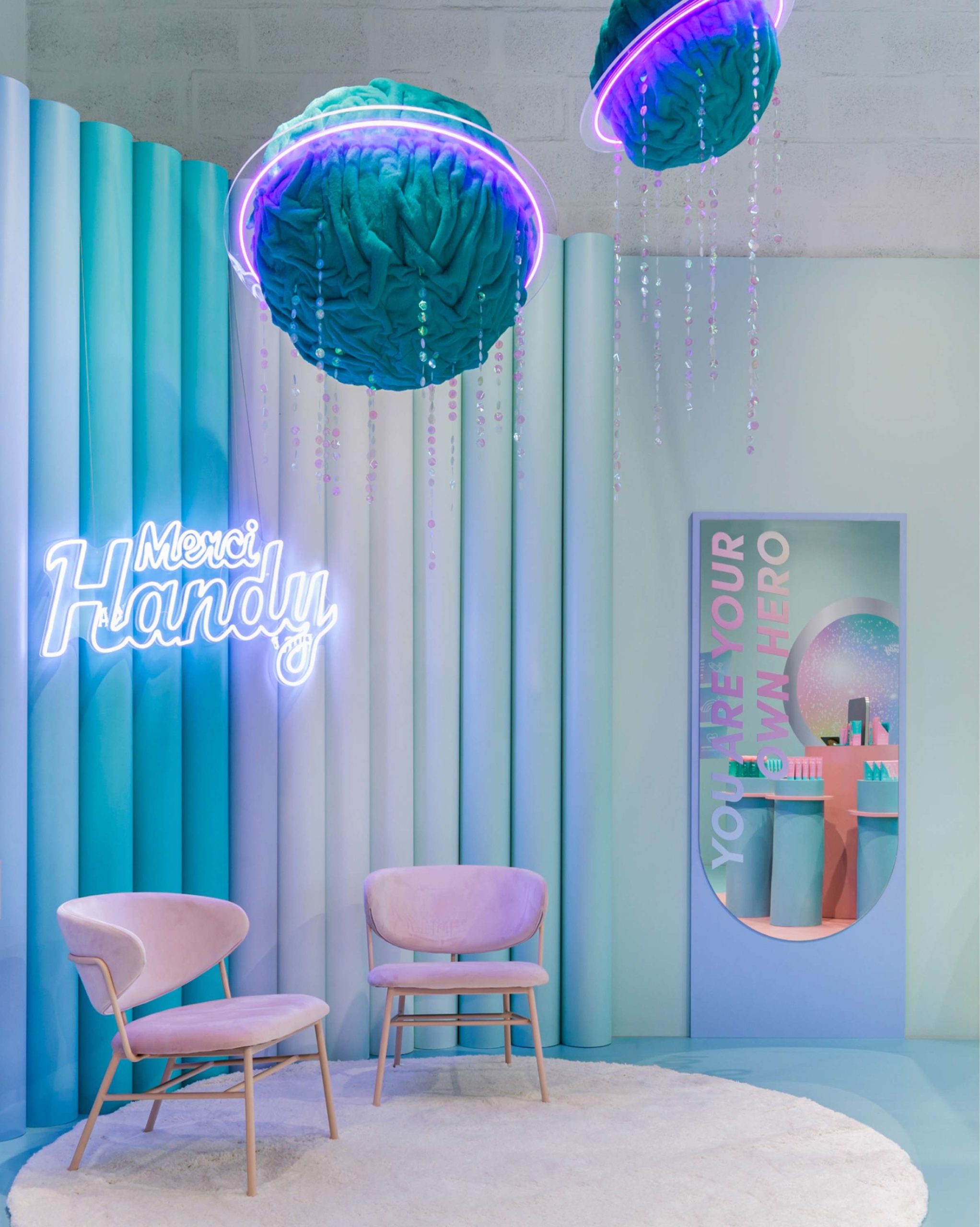 Merci Handy s’explore à travers l’idée d’une scénographie spatiale. Un univers “color-block” fait de textures et couleurs inédites qui offre un voyage sensoriel à travers l’univers de la marque. Ambiance futuriste revisitée, formes organiques et jeux de lumières ultra colorées, leur ADN et les produits phares sont sublimés, et offrent à tous les aventuriers une expérience insolite et inattendue.