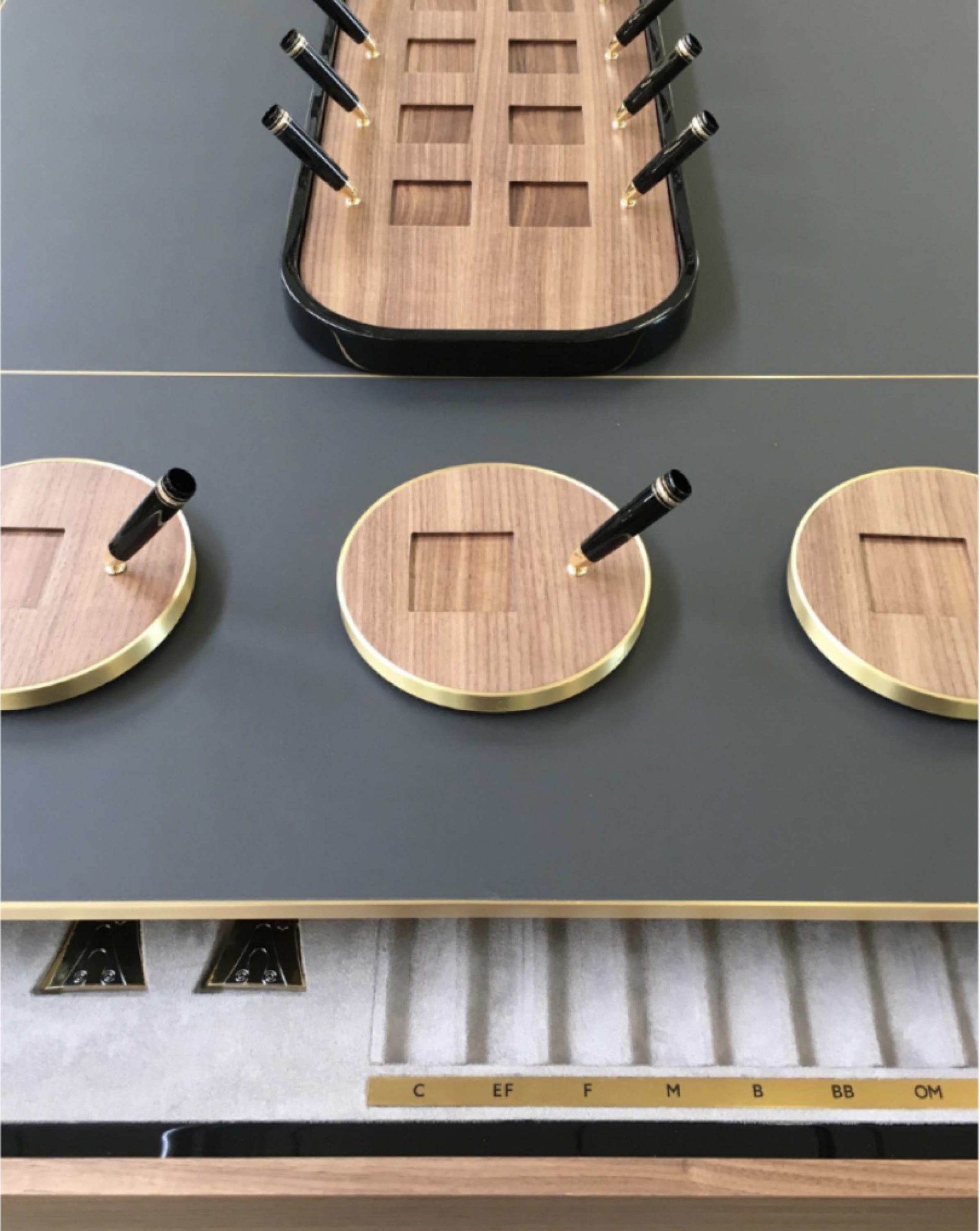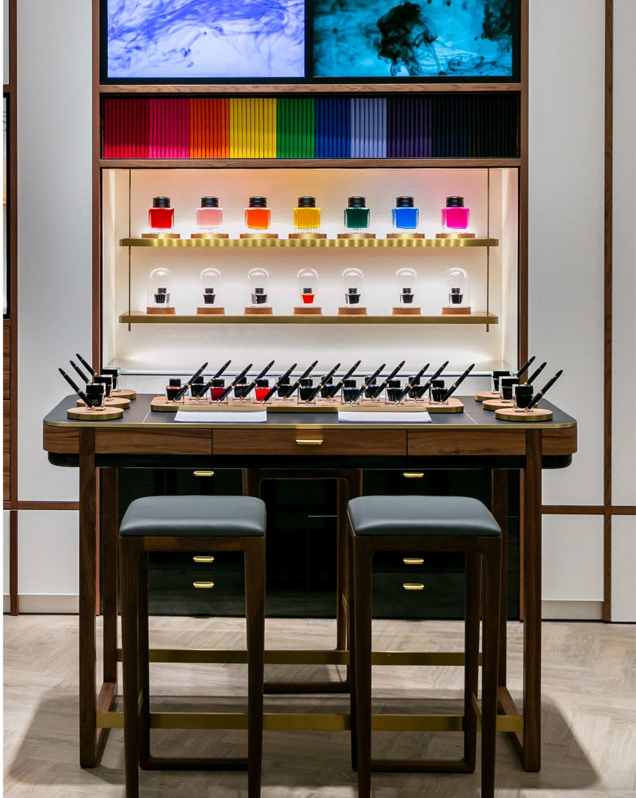 Un bureau élégant et raffiné reprend les codes et matériaux de la boutique, tout en permettant à chacun d’expérimenter les instruments d’écriture de la marque et laisser libre cours à son imagination.