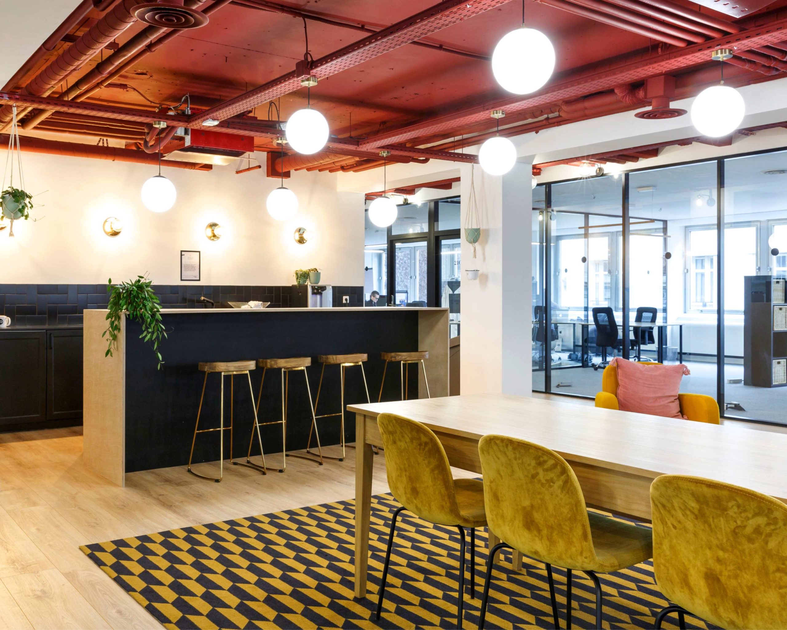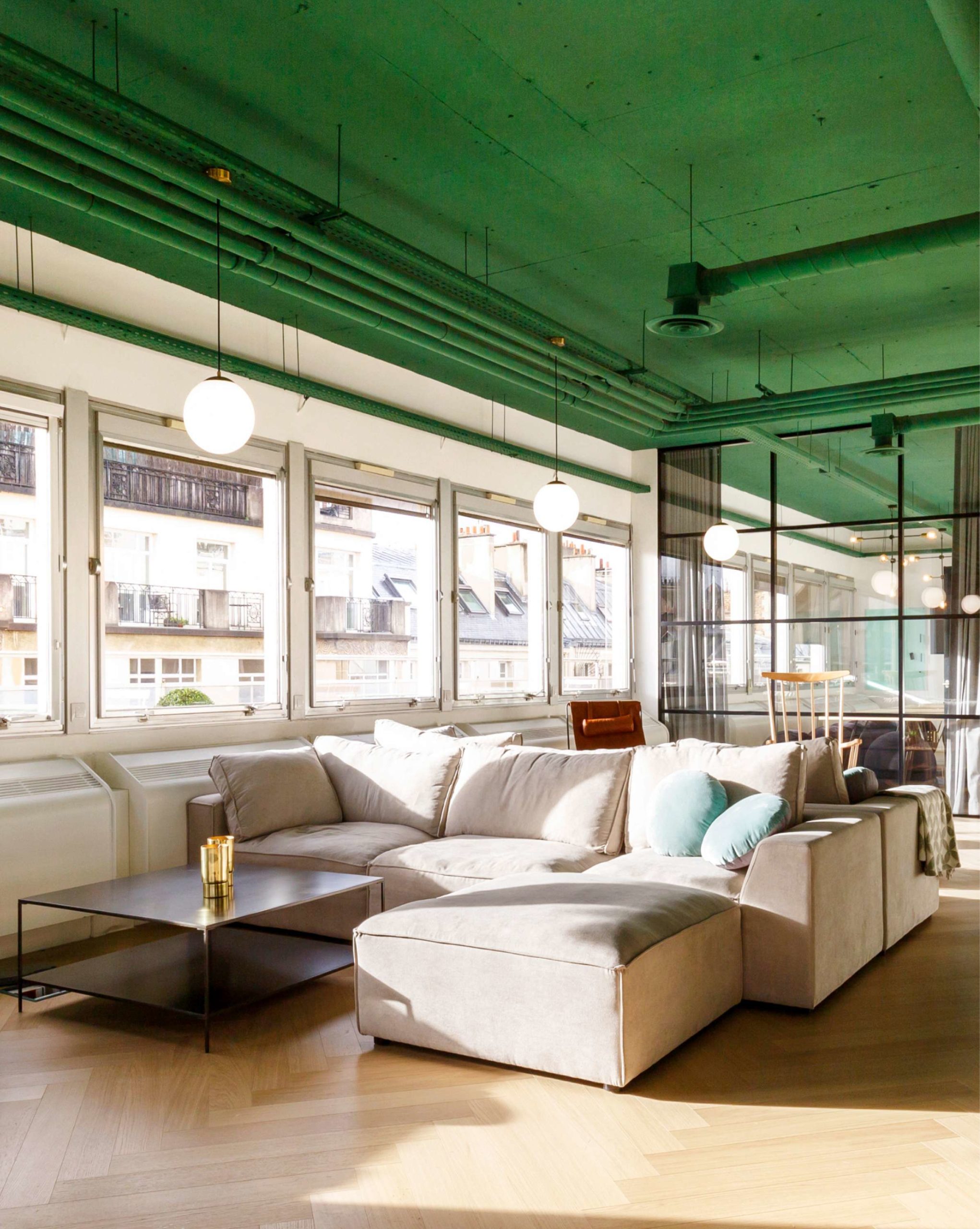 fait partie des espaces de coworking les plus surprenants du 8e arrondissement. Installé dans un écrin d’acier, son intérieur à la fois atypique et chaleureux casse les codes des bureaux traditionnels. Les teintes sont intenses et les plafonds techniques peints créent des espaces à forte richesse chromatique et proposent une expérience sensorielle dynamique.