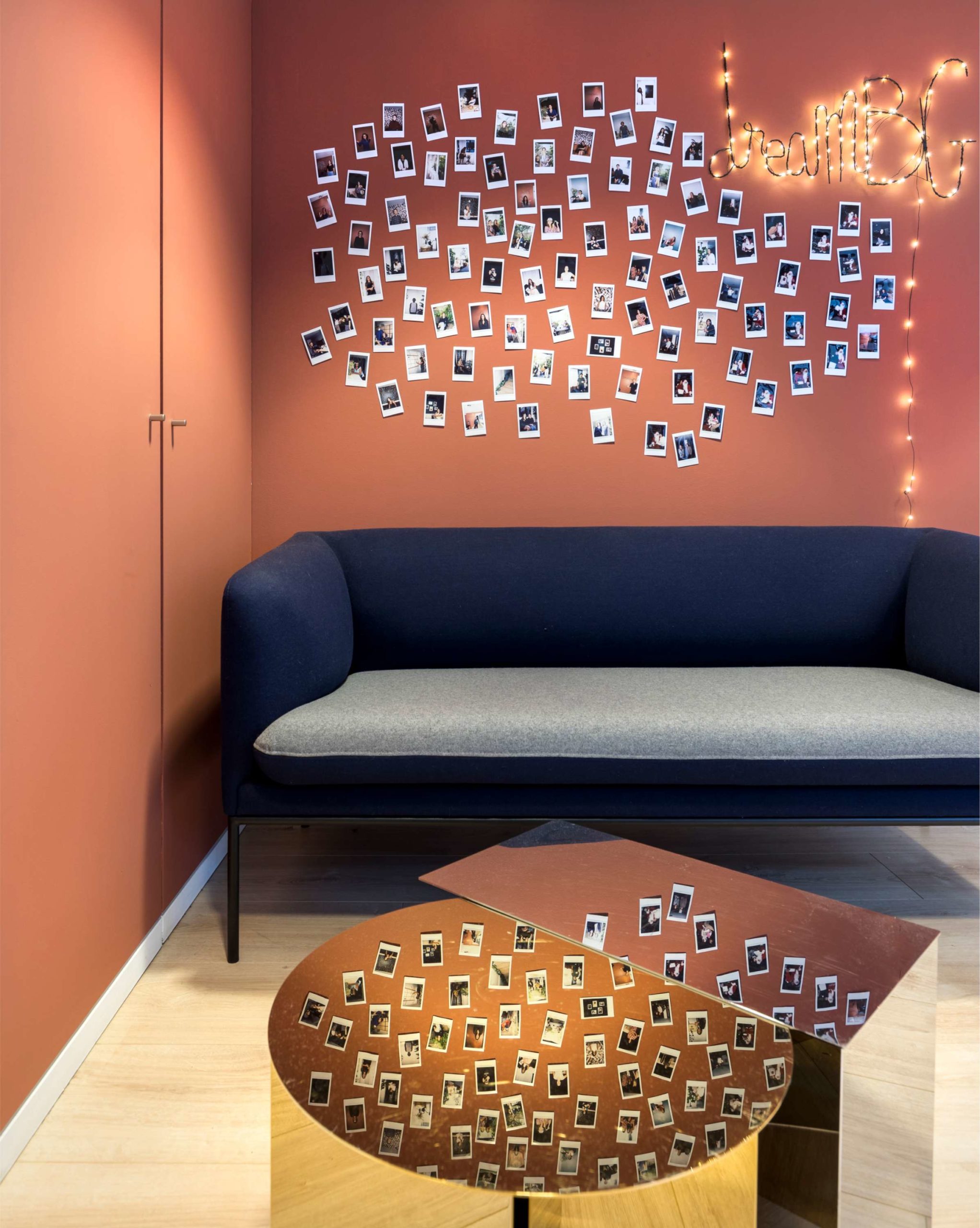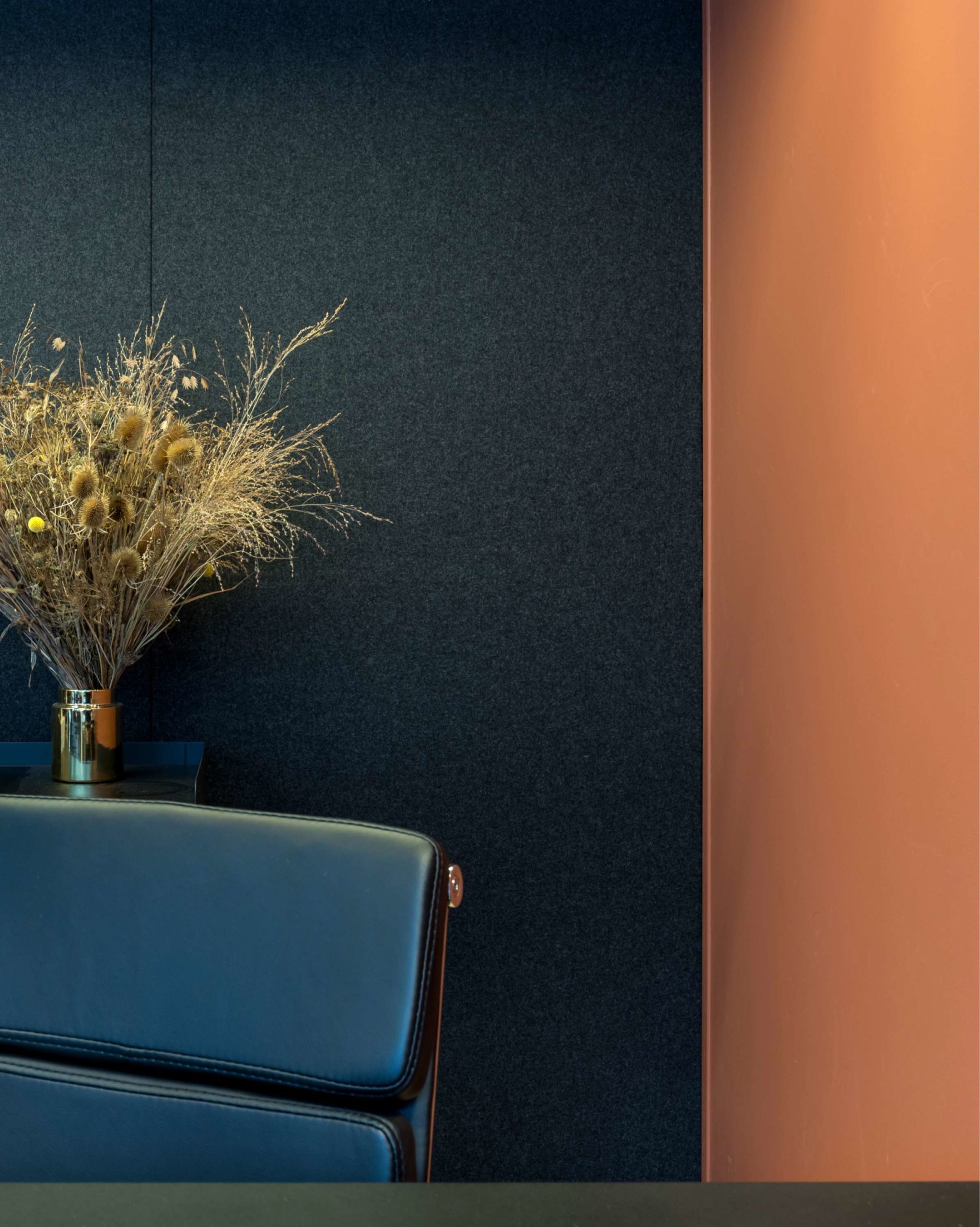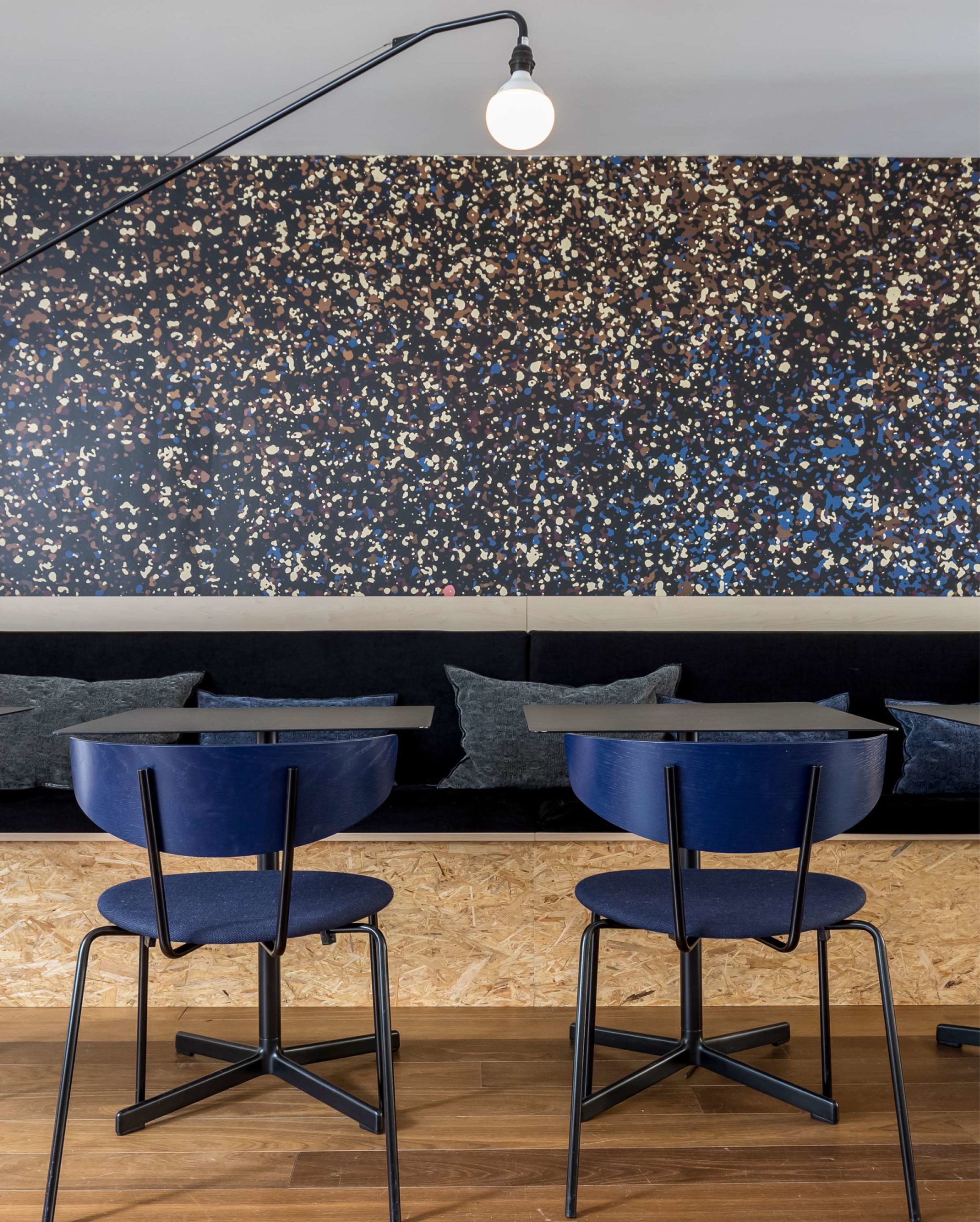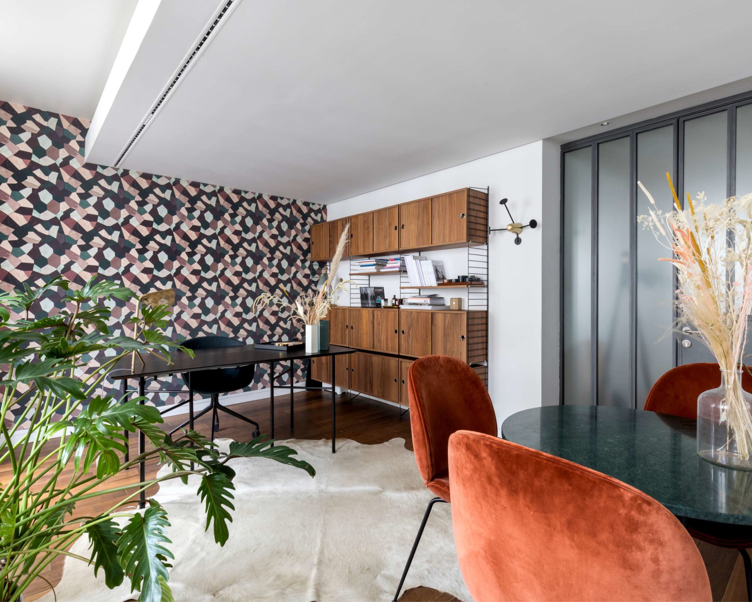 L’espace entremêle de grandes surfaces de coworking – pensées comme des ateliers minimalistes avec des sols en béton ciré gris et des suspensions métalliques -, et des bureaux fermés plus intimistes, réchauffés par du velours teinte rouille, du bois de noyer et des papiers peints à motifs.