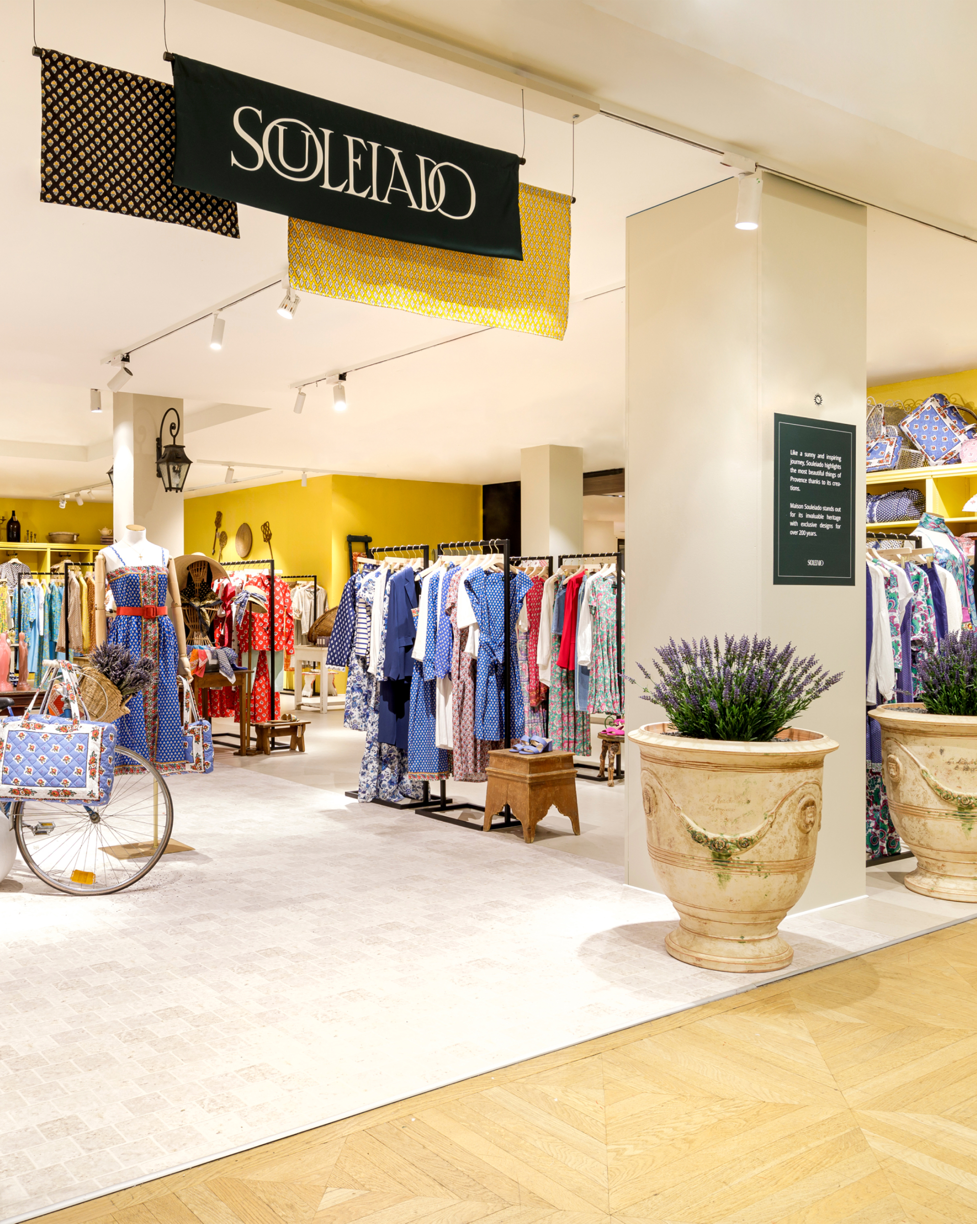 la Provence, le soleil, la lavande et les motifs ultra colorés constituent l’ADN de Souleiado. Cette marque pleine d’histoire reprend des couleurs en 2009 et se modernise pour rayonner en 2024 dans un corner éphémère du Bon Marché à Paris.