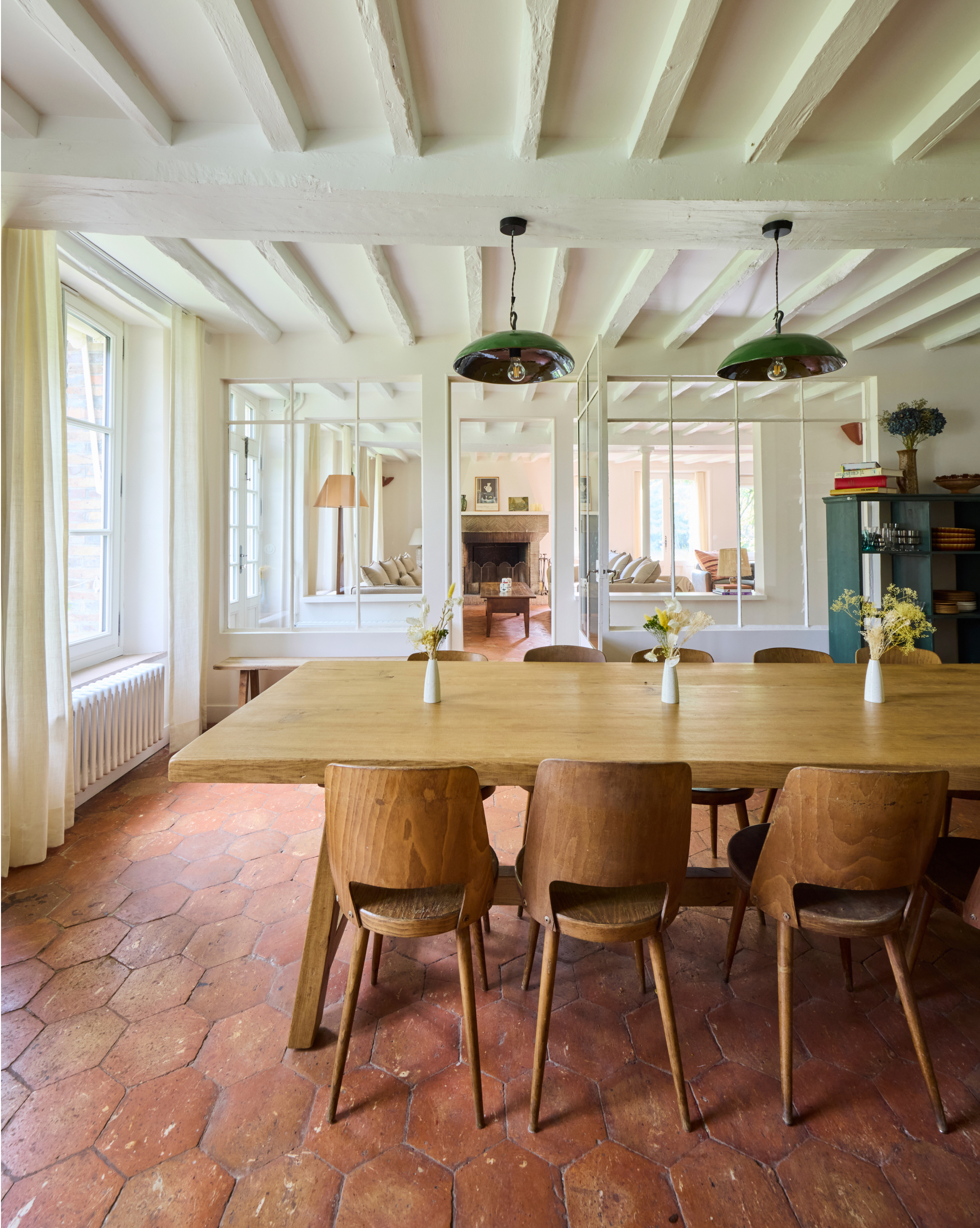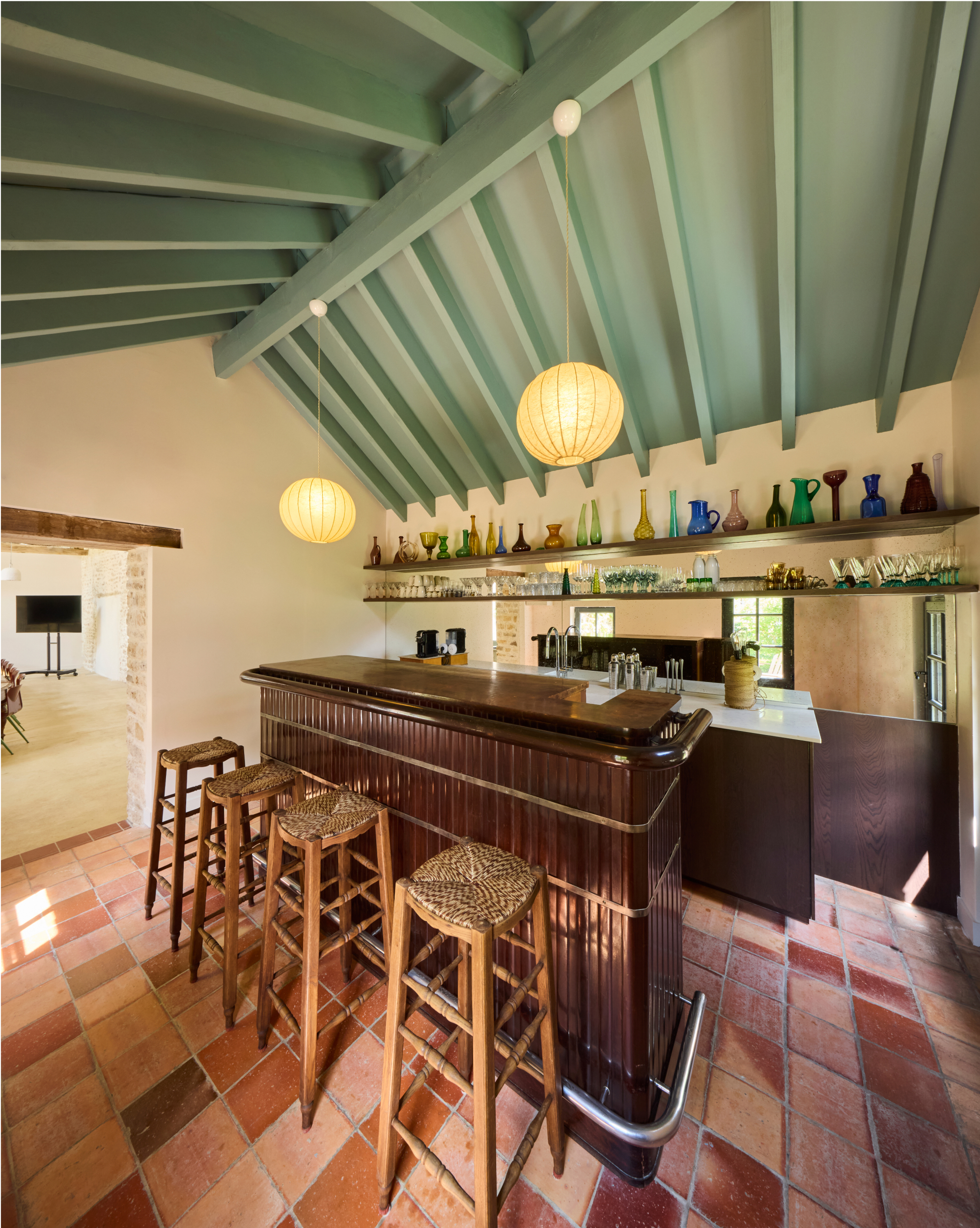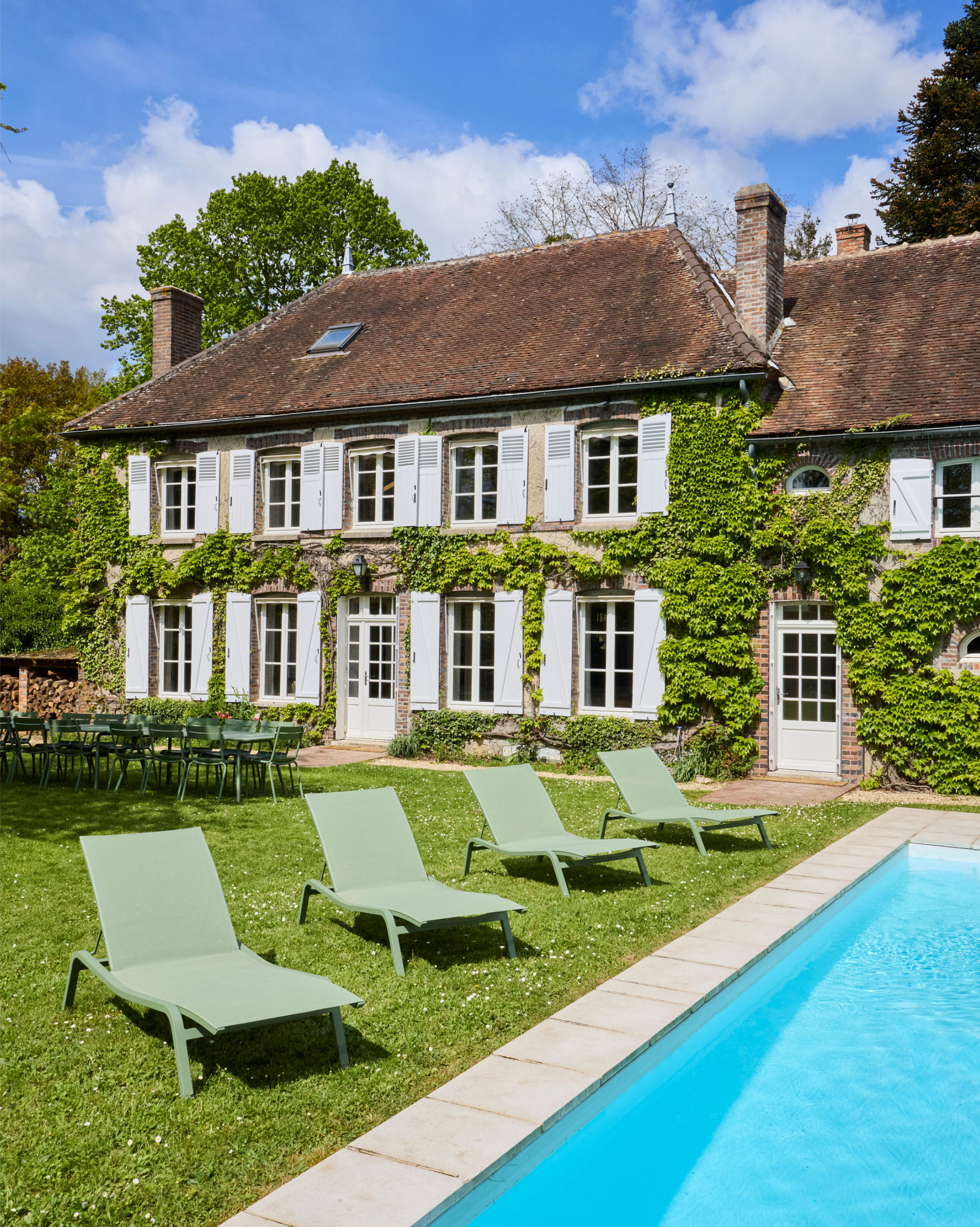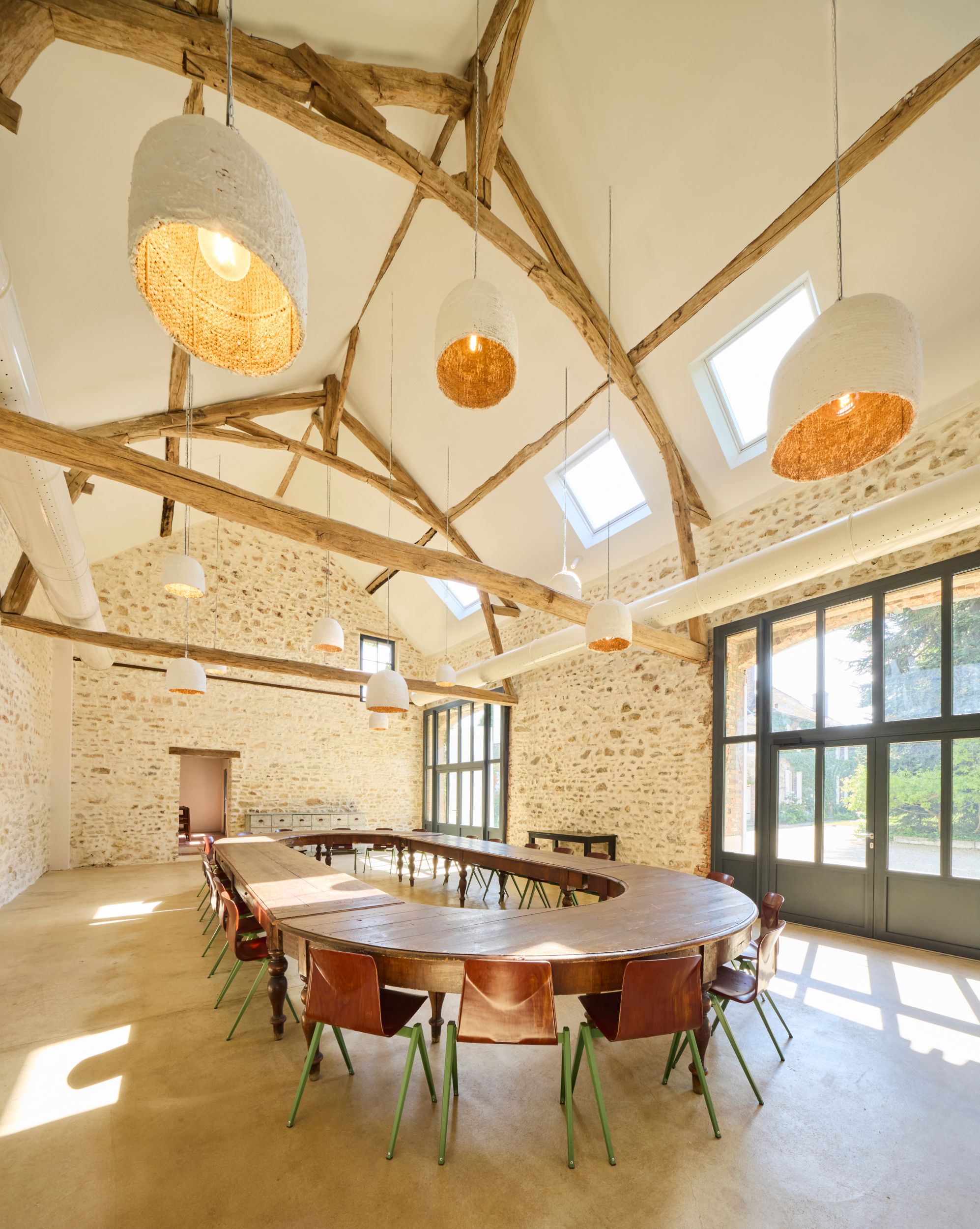 conserve l’essence d’une authentique maison de campagne. Du bois ancien, des tomettes, un papier-peint d’origine et une crédence pleine d’histoire. Hybride et adaptable elle est constituée de deux bâtiments, d’une grange métamorphosée pour les séminaires, et d’une piscine extérieure.