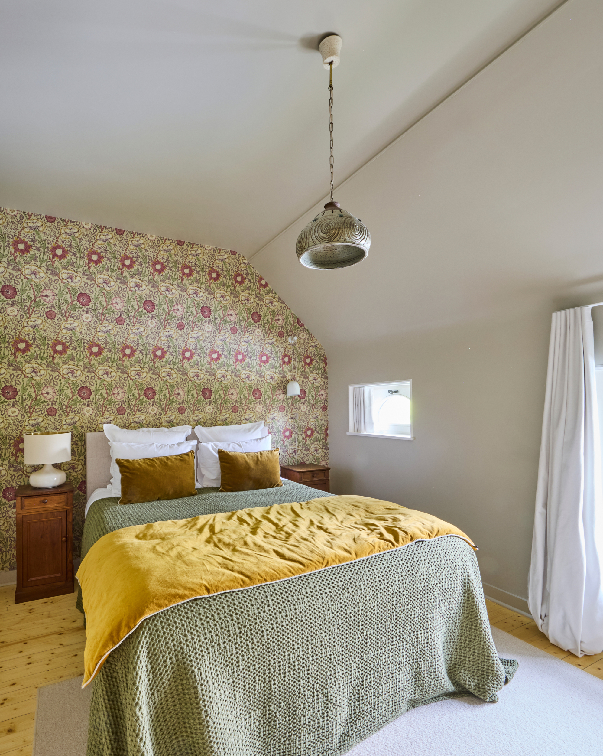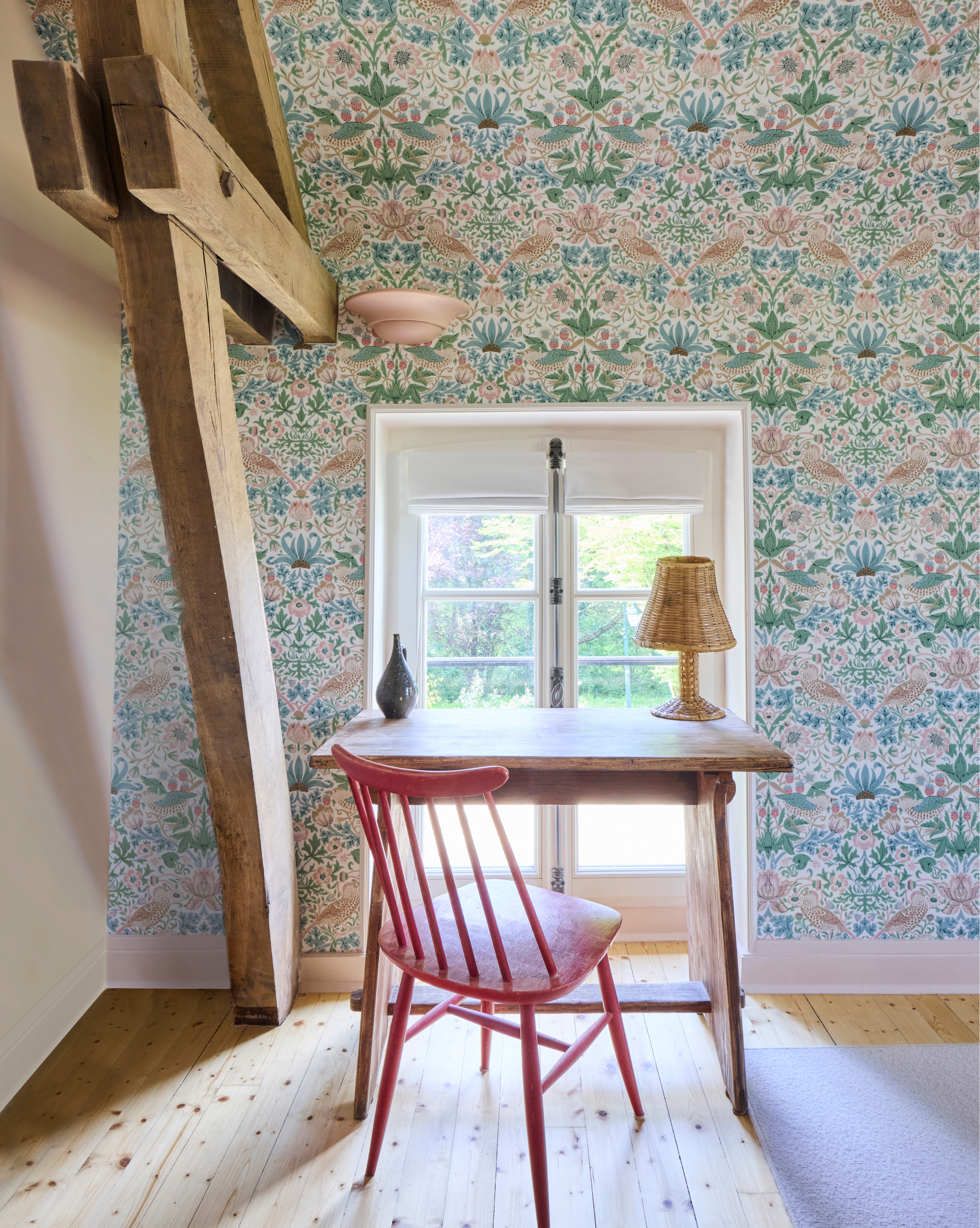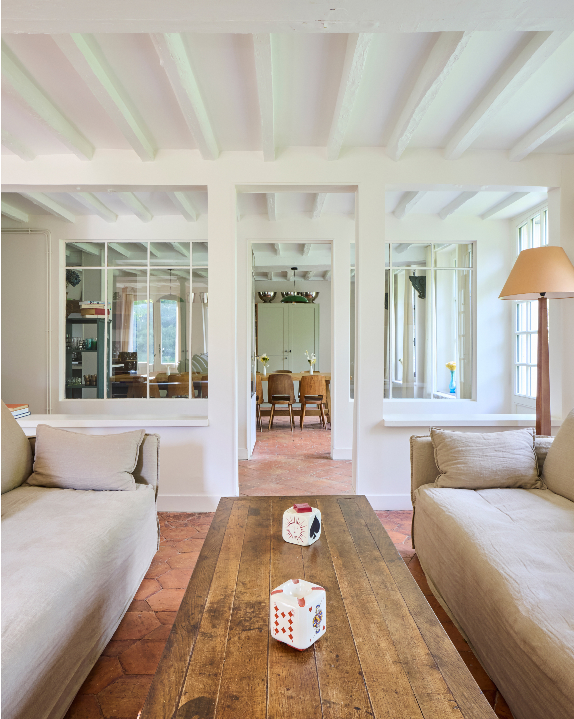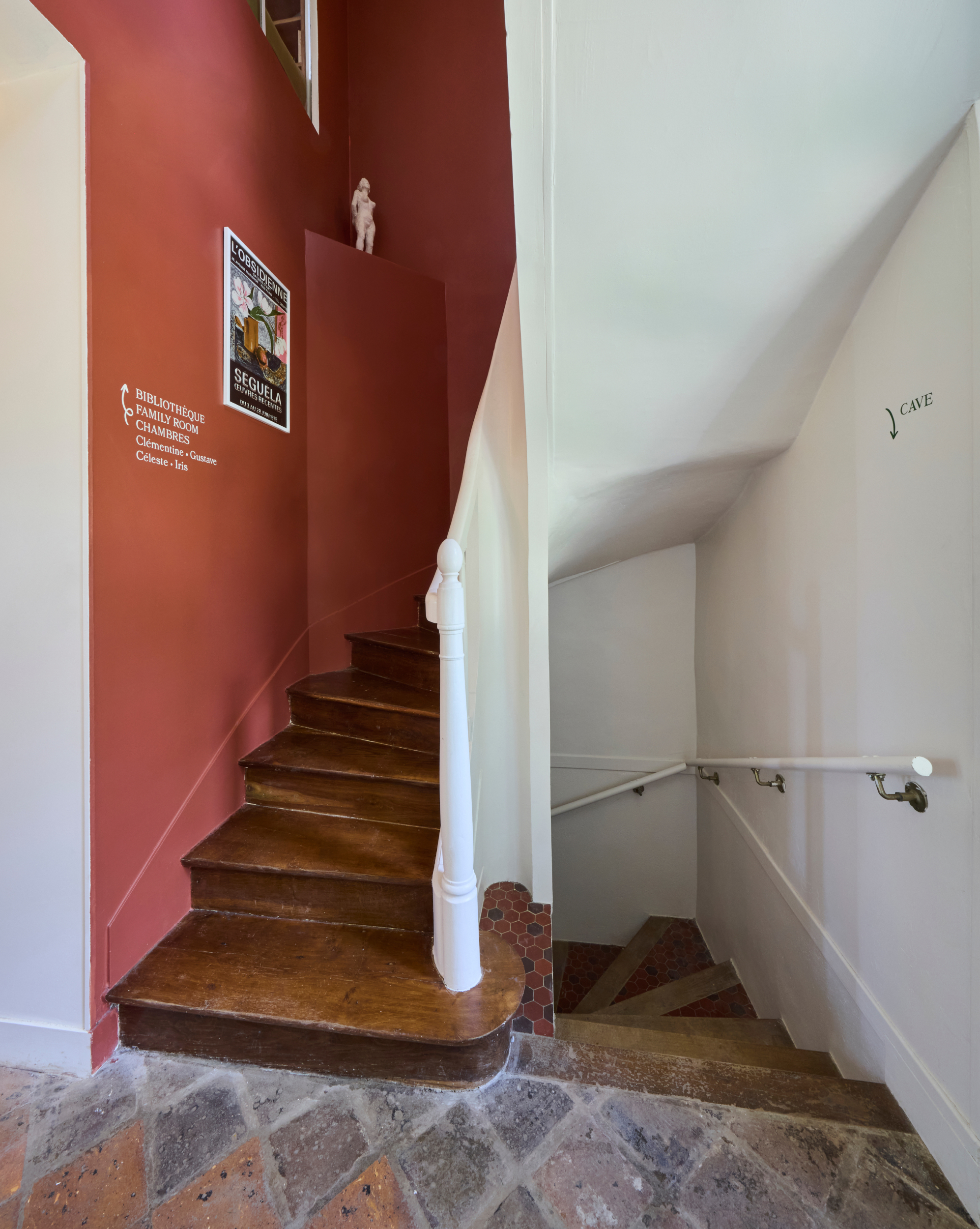 conserve l’essence d’une authentique maison de campagne. Du bois ancien, des tomettes, un papier-peint d’origine et une crédence pleine d’histoire. Hybride et adaptable elle est constituée de deux bâtiments, d’une grange métamorphosée pour les séminaires, et d’une piscine extérieure.