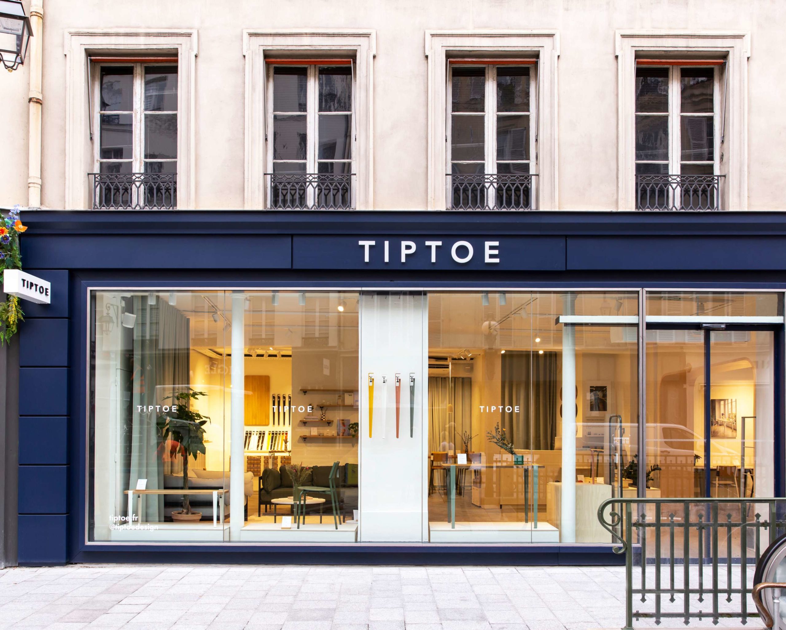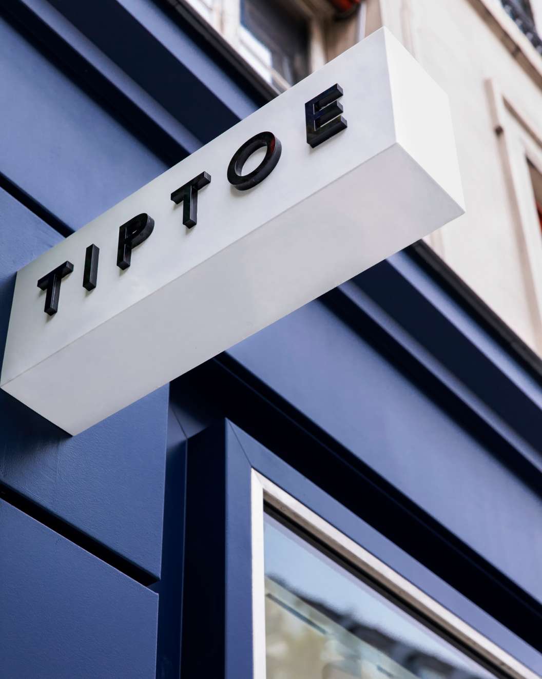 Ici, la façade bleu foncé fait écho à la couleur signature de Tiptoe. Pour présenter de façon désirable l’offre de la marque, des podiums ont été créés spécialement pour le lieu afin de faire tourner les produits en vitrine.