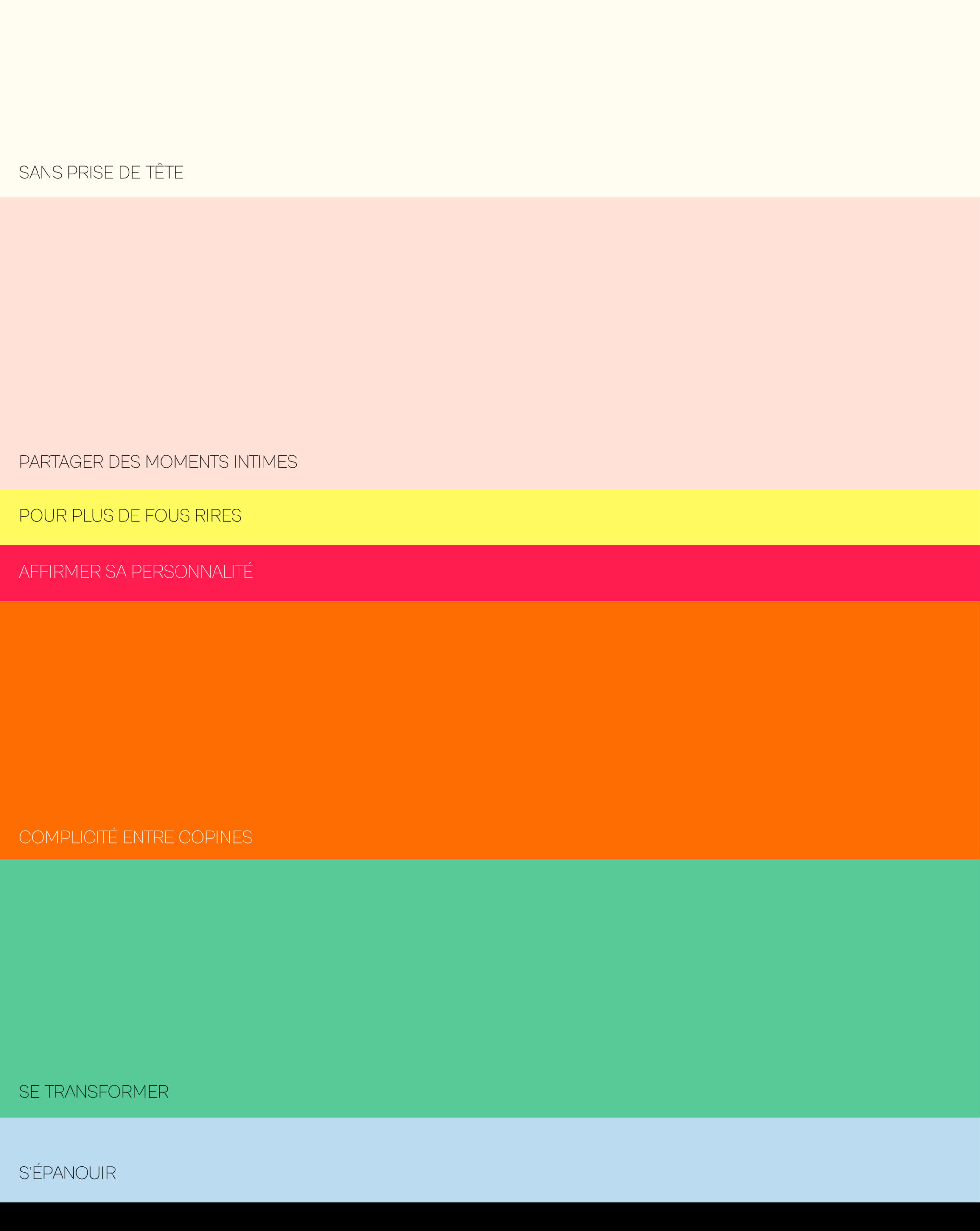 Des couleurs solaires ont été privilégiées afin de retranscrire les moments de joie entre copines et cette période de la vie où l’on affirme sa personnalité. Le vert et le bleu illustrent l’éveil du corps au printemps de la vie.