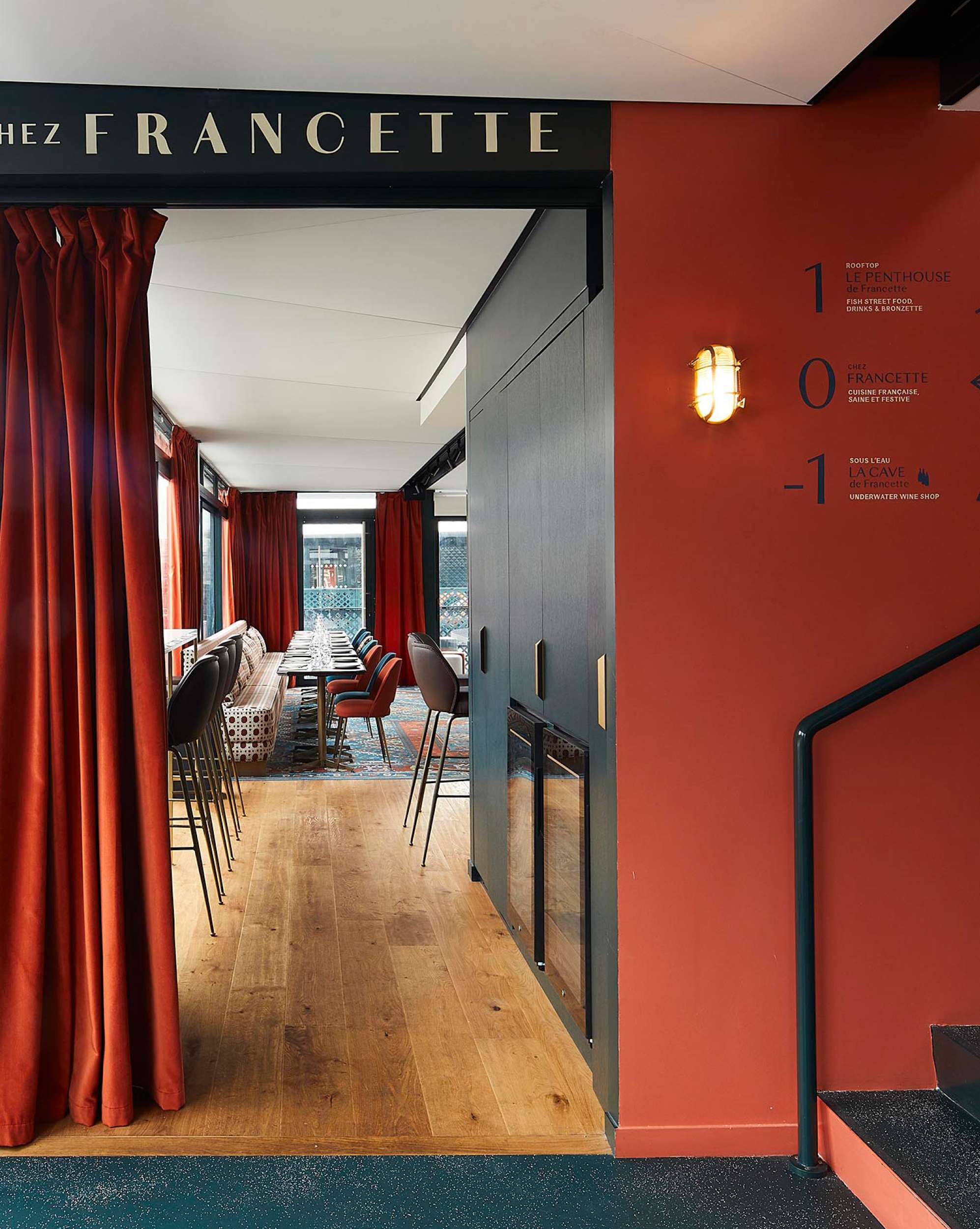 avec un lieu si propice à l’évasion, notre équipe propose aux deux associés de s’inspirer des grandes traversées sur l’Atlantique de la fin du XIXème siècle, âge d’or du France et époque la construction de la Tour Eiffel. Ce fil rouge est décliné sur les trois niveaux et cinq espaces : de la cave à vin située dans la cale de la barge, au Penthouse sur le pont supérieur, en passant par le bistrot traité comme un Gentlemen’s club.