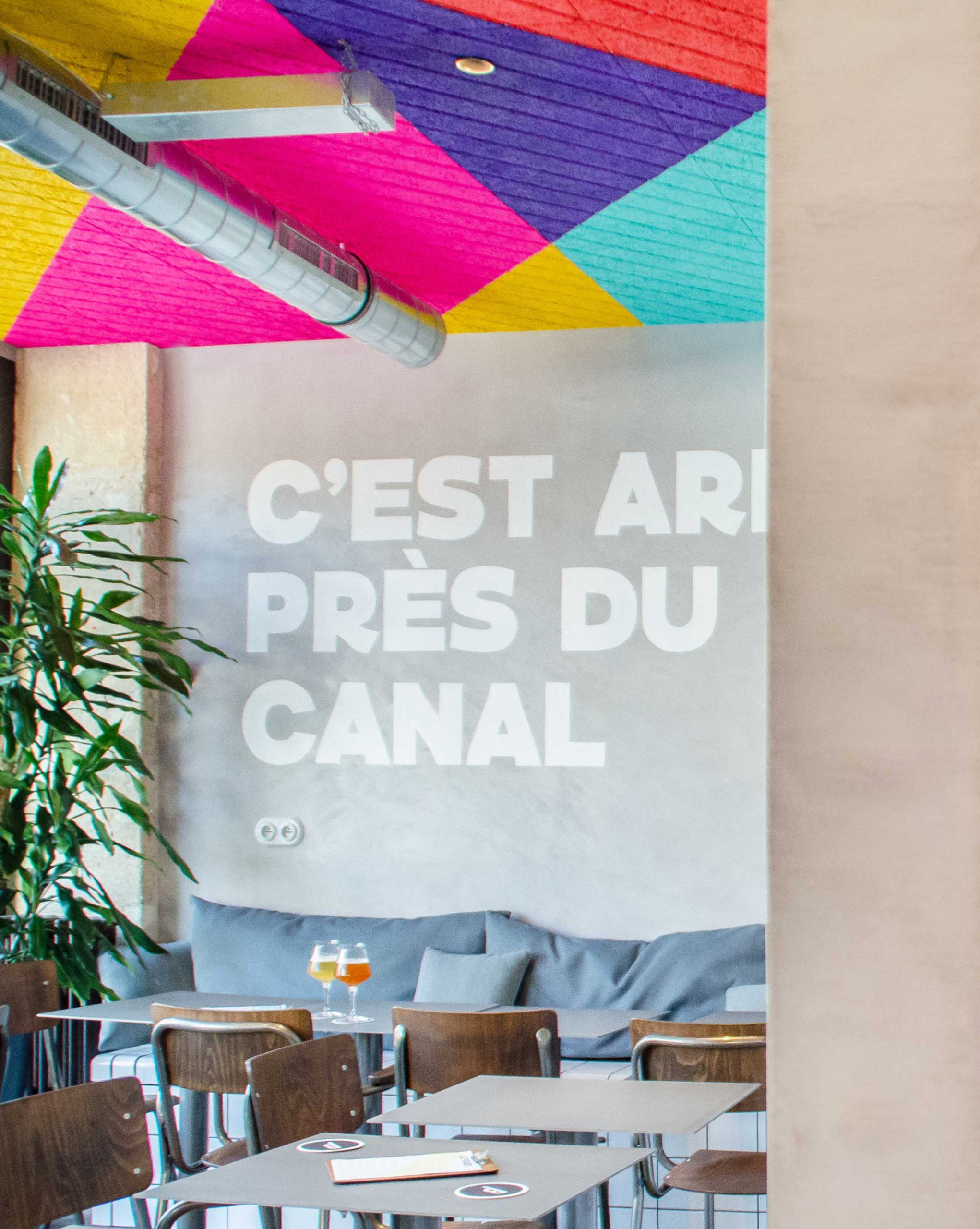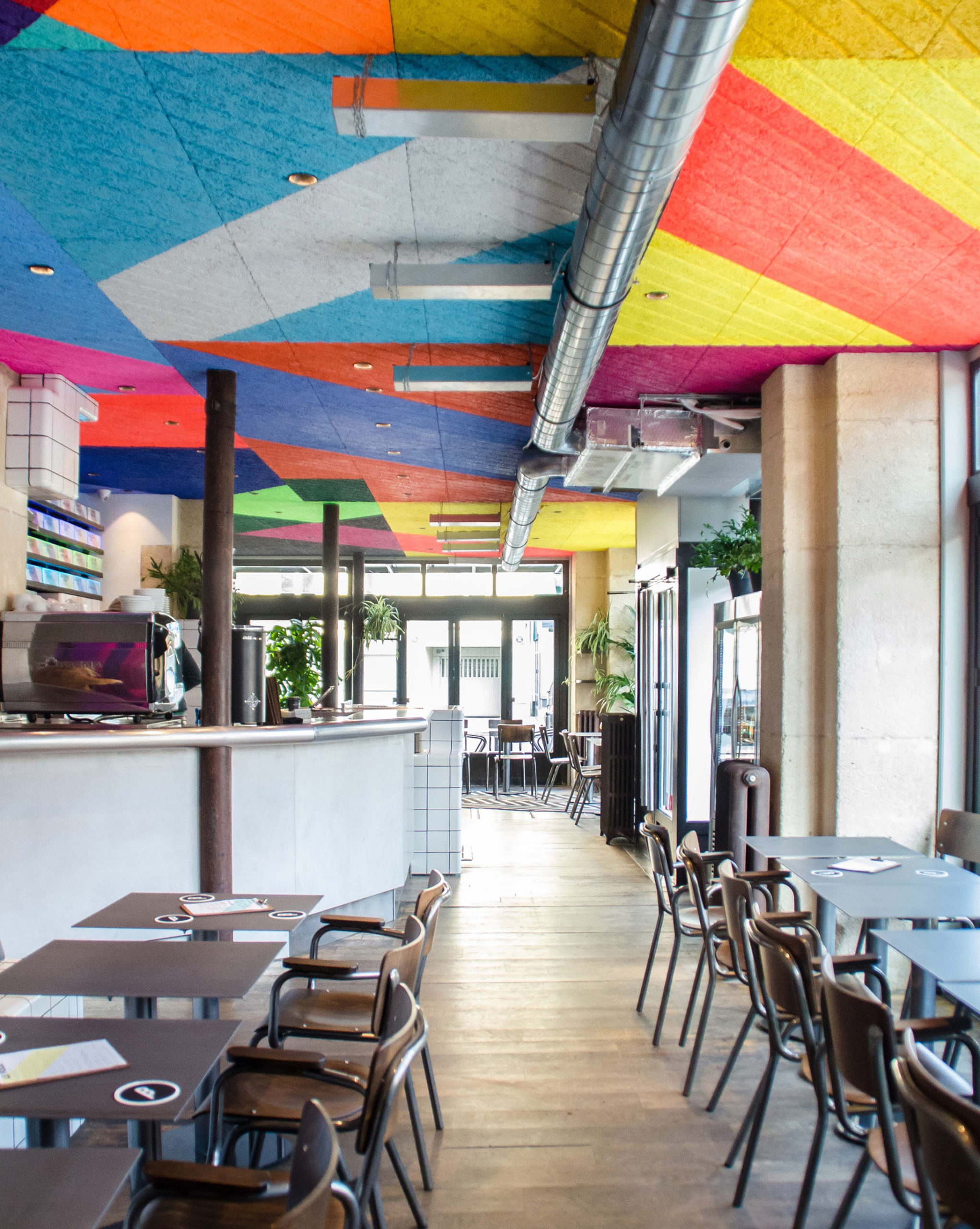 un fil conducteur avec le bar BBP Pigalle est déterminé, tout en conférant à l’espace sa propre singularité : la ligne de Terrazzo qui traversait le sol du premier bar est cette fois-ci réinterprétée au plafond, avec une œuvre graphique et colorée.