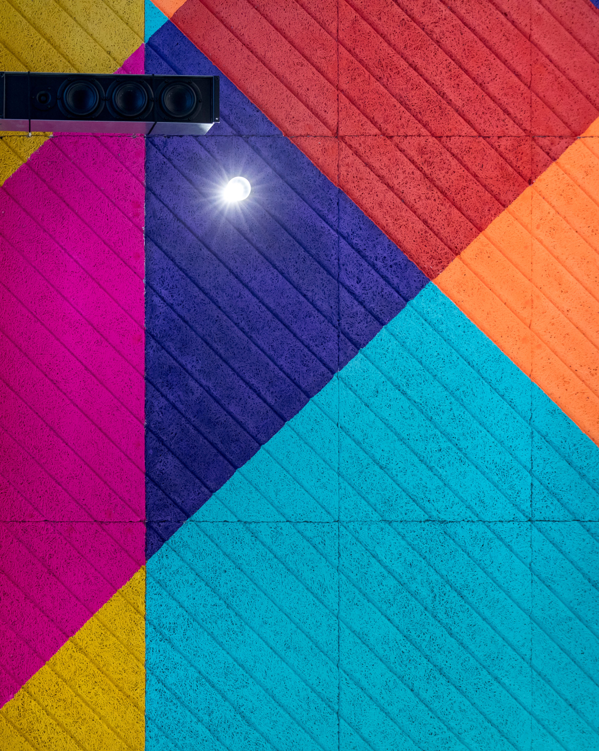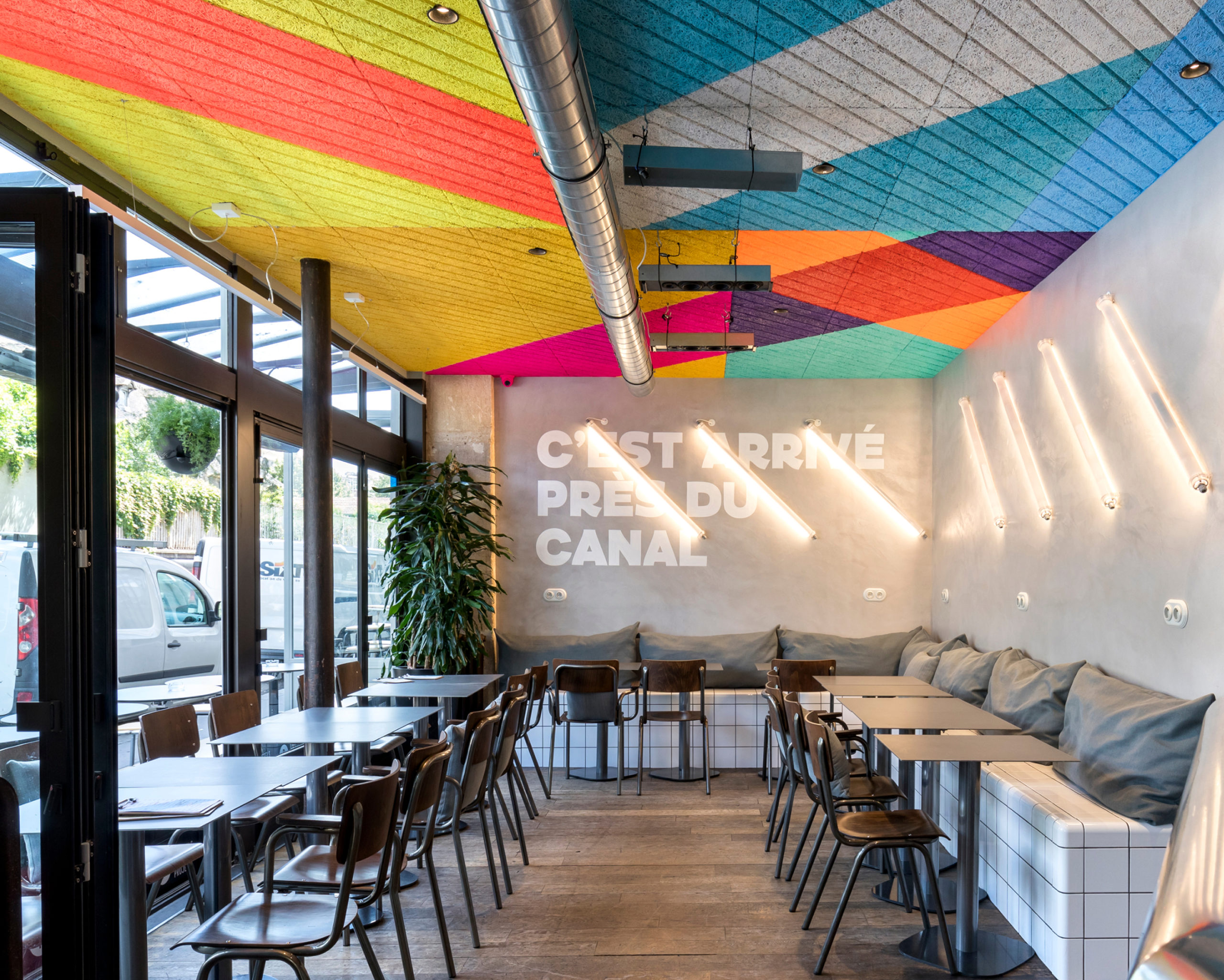 Les panneaux acoustiques du plafond sont peints d’une composition artistique imaginée à partir du graphisme pop et coloré des étiquettes de bières de la marque.