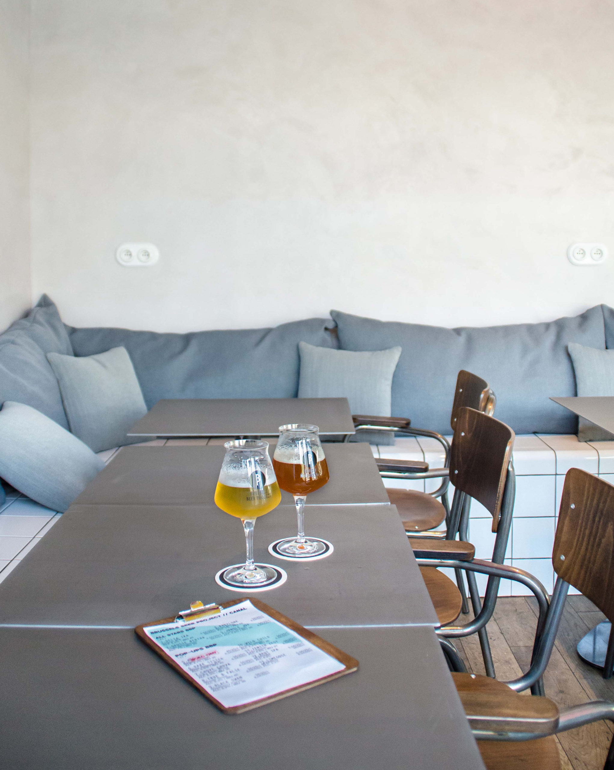 Le reste de l’espace réemploie les codes industriels présents dans les autres Taprooms de la marque : béton gris clair et mobilier en métal et bois brun.