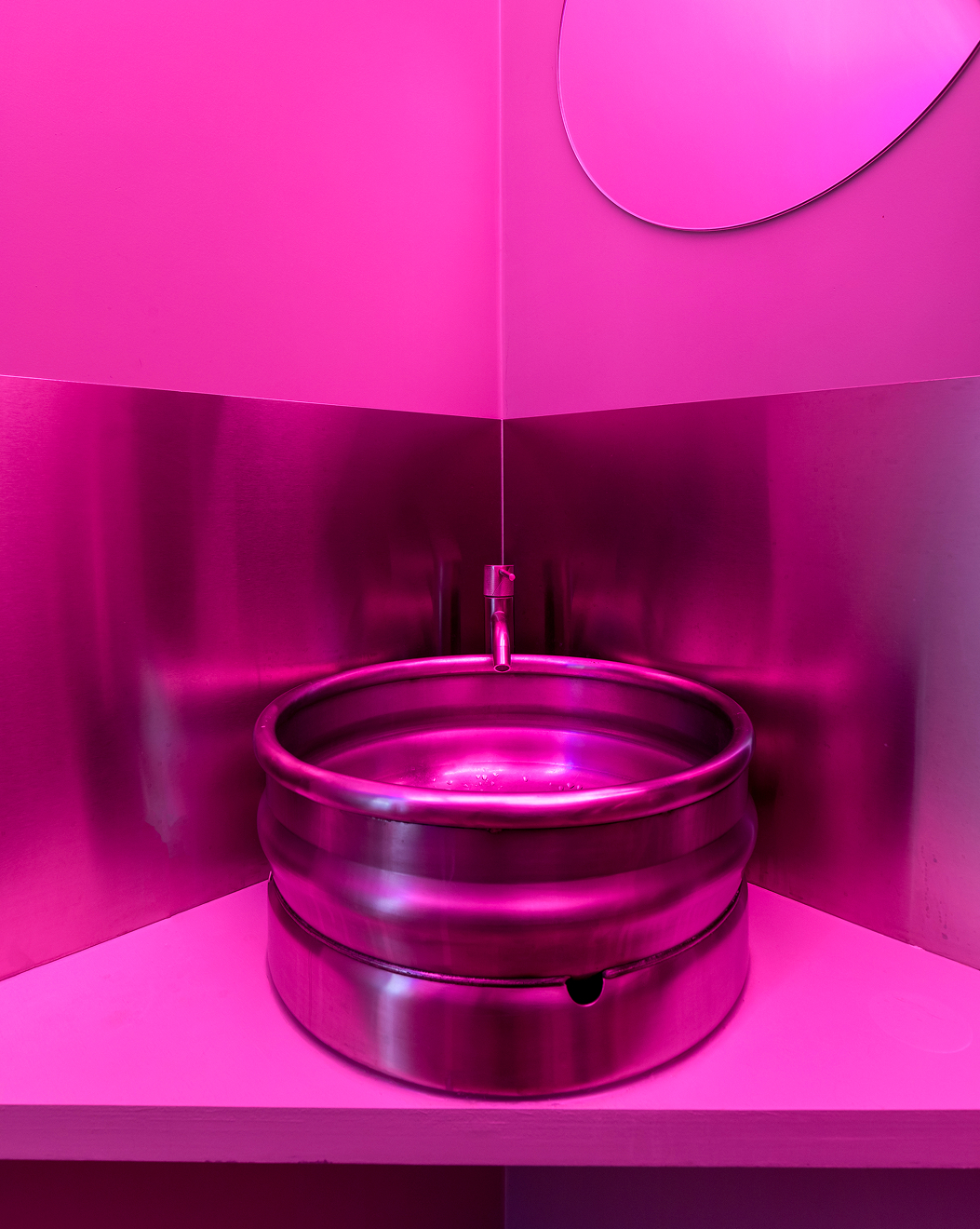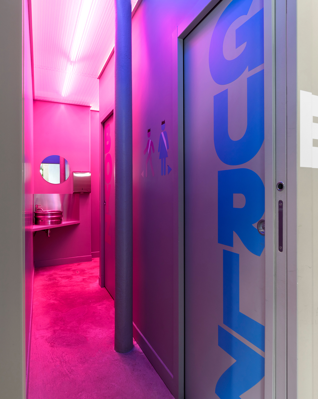 Dans les sanitaires, l’ambiance est radicale et contrastée. Un effet “color block” rose est créé grâce à un jeu de néons lumineux qui se reflètent sur les murs en béton.