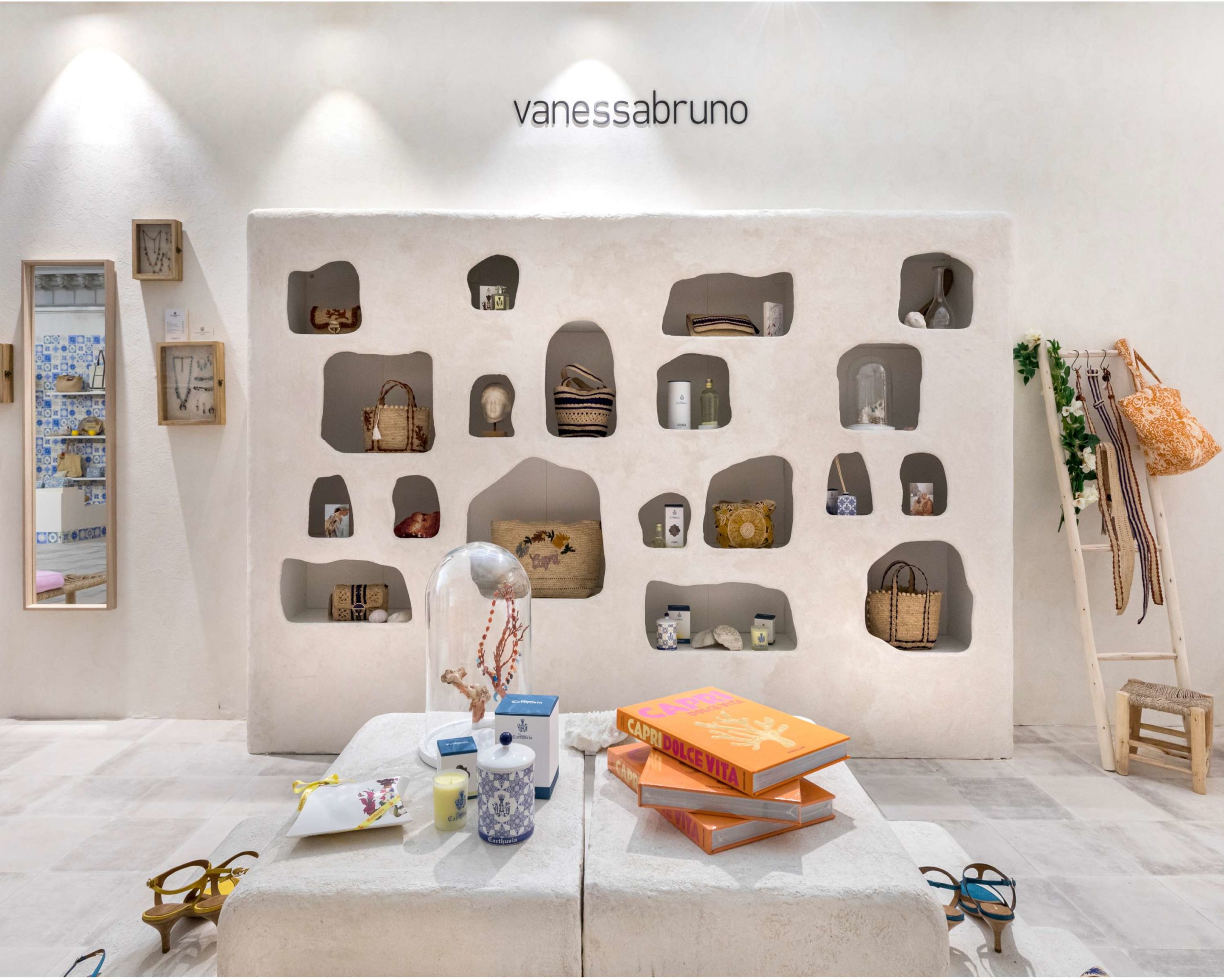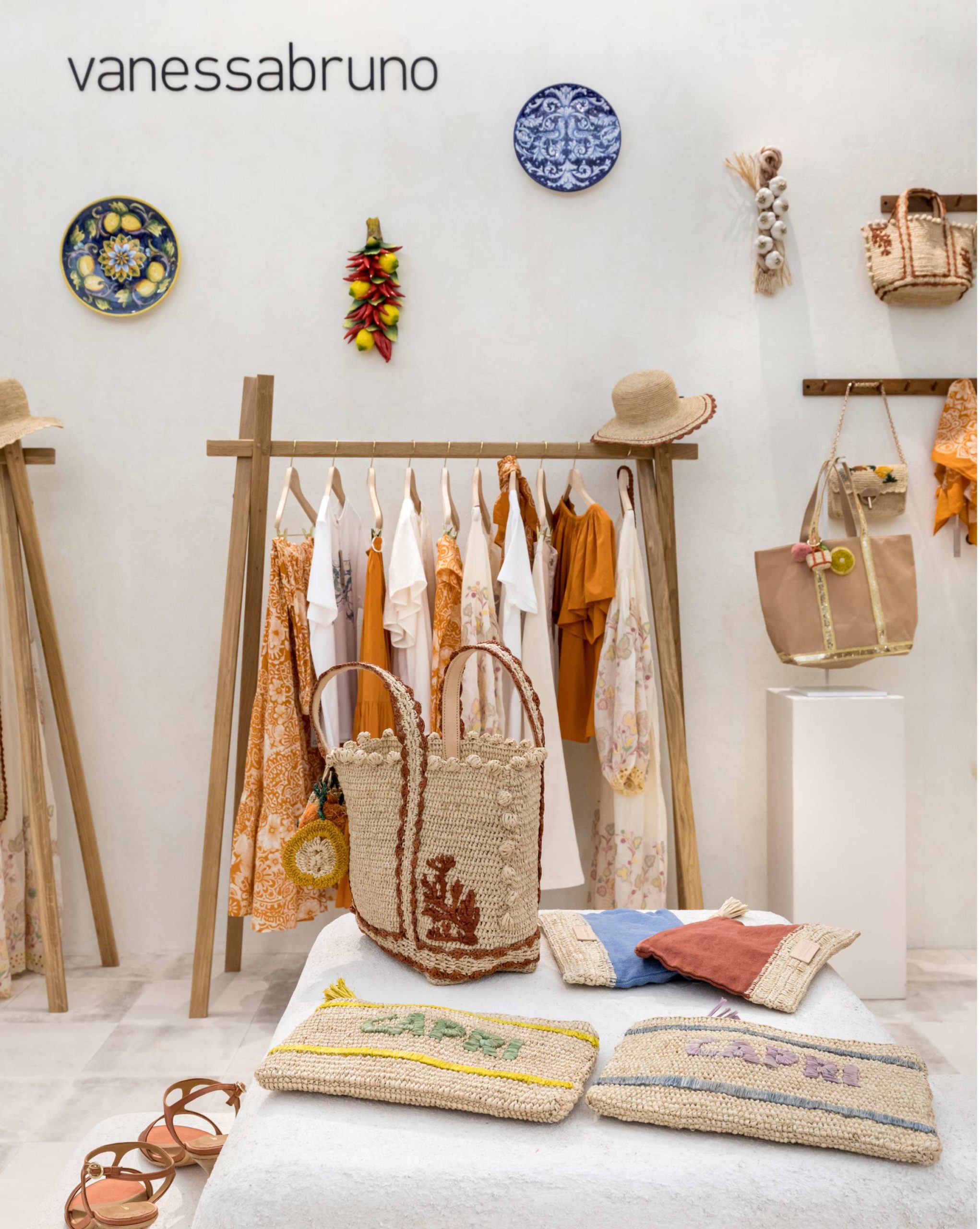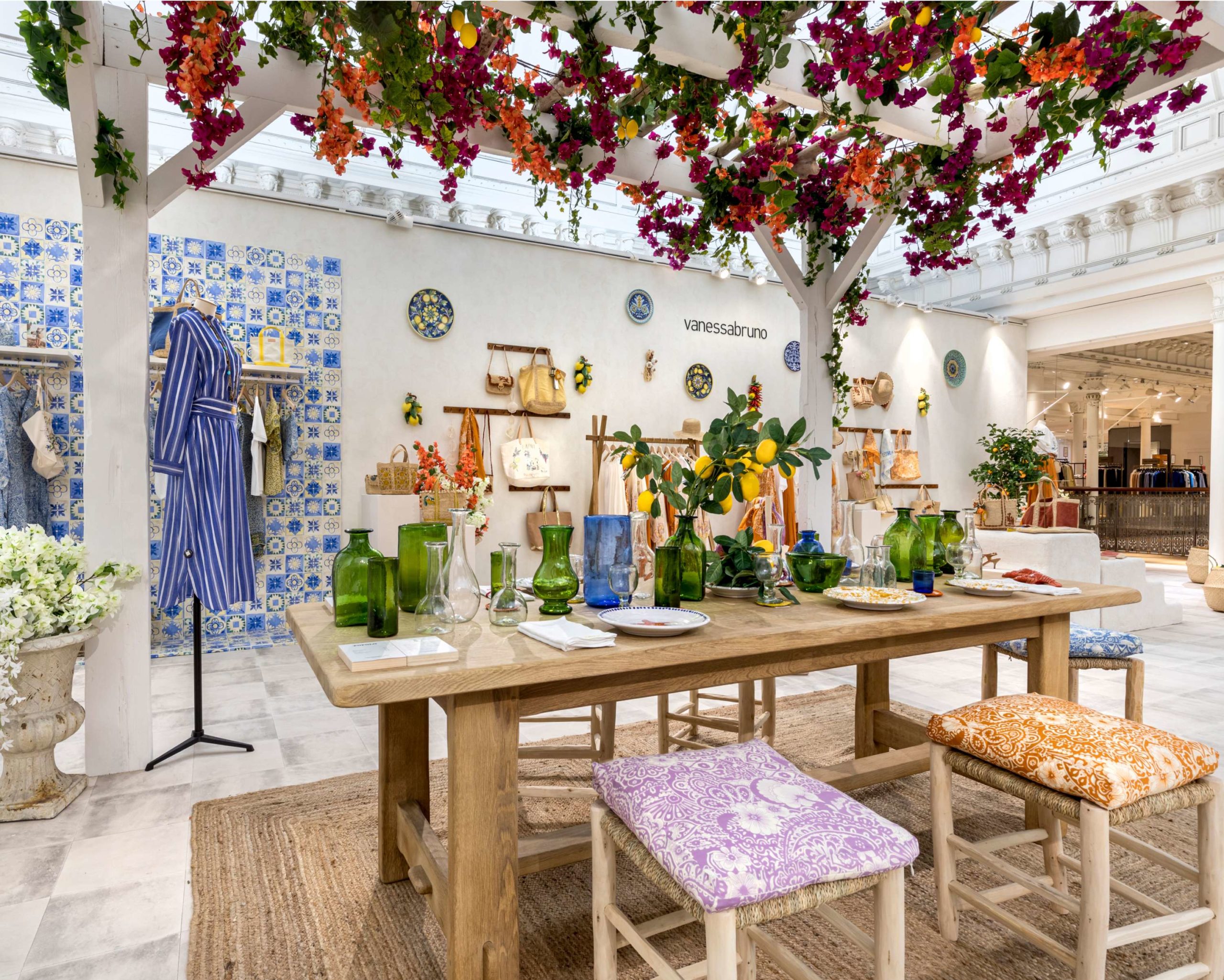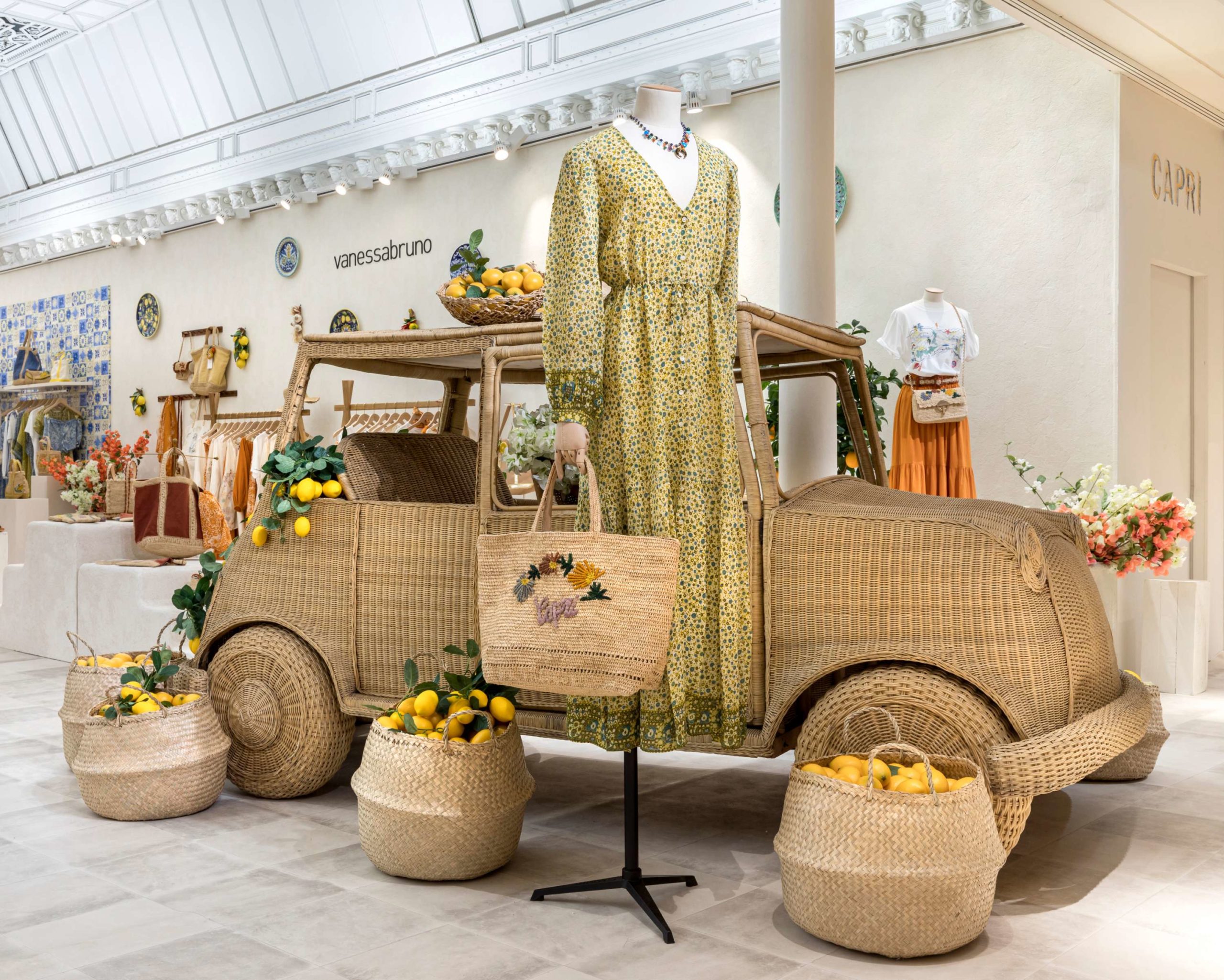 C’est au 2e étage de ce grand magasin typiquement parisien que Vanessa Bruno décide de créer un nouveau corner totalement immersif. L’objectif est de mettre en avant le cabas personnalisable de l’été dans une ambiance qui évoque l’île italienne.