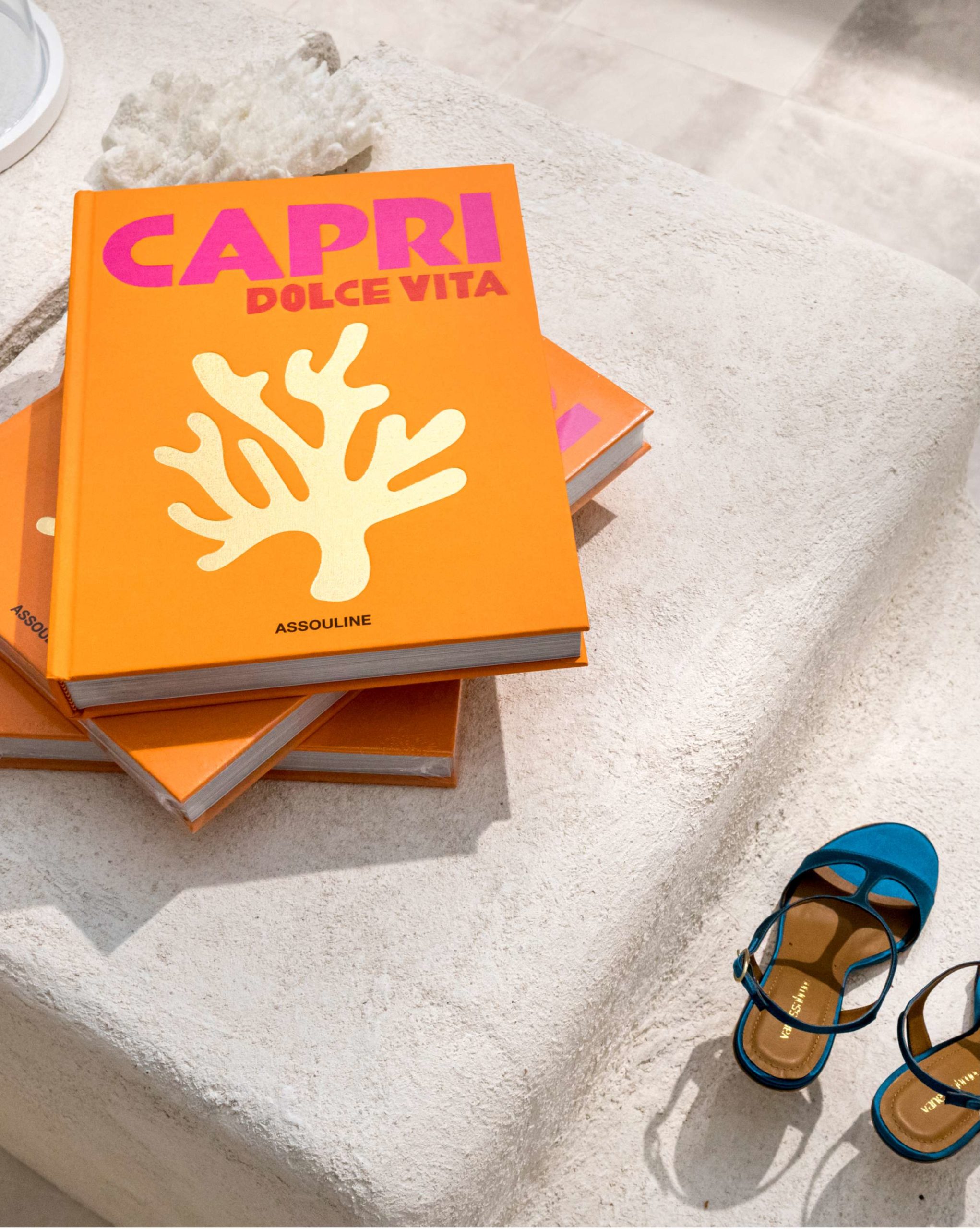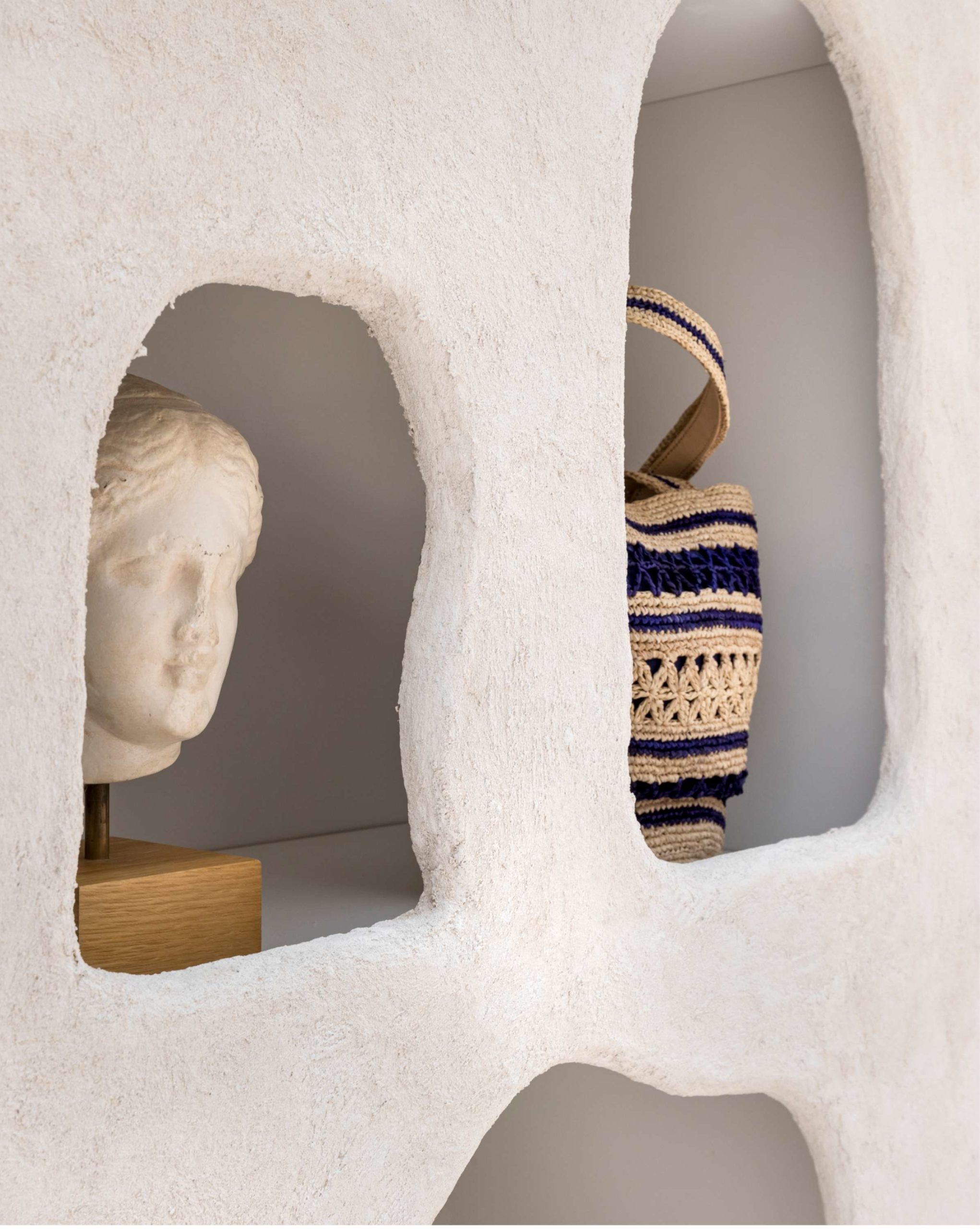 Des éléments identitaires et propres au lieu, viennent rythmer l’espace, comme cette mosaïque ayant inspirée la collection, ou encore ce large meuble à niches dont la texture évoque la roche de Capri.